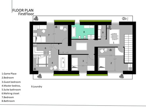 - PRIMER PISO: en el primer piso, en cambio, nos gustaría tener 2 dormitorios dobles (uno de ellos con baño en suite) incluso 3 (*) si es posible y dos dormitorios individuales; un baño y un área de almacenamiento / lavandería; tal vez un vestidor.