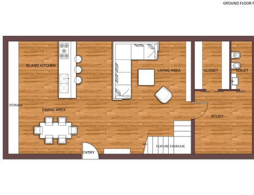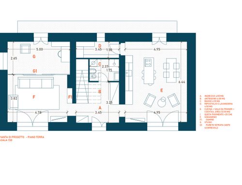 - GROUND FLOOR, we would like to modify the existing staircase, with a modern one. We would like a spacious and functional kitchen and possibly contiguous to the living area. Or an open space, with the opportunity of being separated if necessary with a sliding door. We would like to keep the fireplace, not necessarily where it is. We would like to create a bathroom, a closet and a study area.