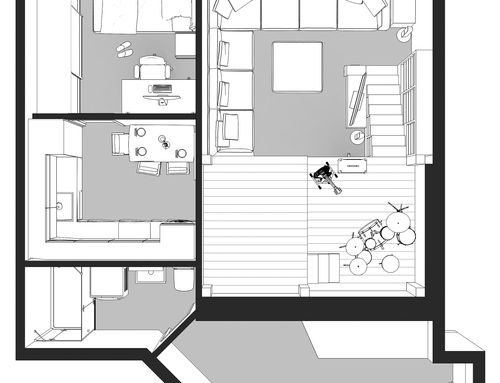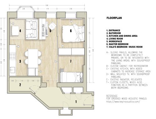 Al principio quería poder hacer una gradación profesional de coloraturas en el piso, ahora quiero poder tocar música con él sin preocuparme por el ruido y por supuesto hacer posible hacer una mezcla de sonido profesional también. No solo yo, sino también algunos clientes cercanos e íntimos. Simplemente abordar el piso lo hará un poco más pequeño. ¿Qué piensan, puedo tener todo esto o solo grandes sueños en un piso pequeño? Suena complicado, pero no veo un cine en casa cursi, mas bien veo una casa con una pantalla de 90-120 pulgadas y un proyector profesional y capacidades de mezcla de sonido profesional de sonido 5.1 (bajo presupuesto, por supuesto). En mi mente tengo miedo de perder la sensación de espacio, por eso quiero tener diferentes diferencias de altura, por ejemplo, para una "sala de estar" o un escritorio de edición feo que debe mirar hacia la pantalla. No lo sé. Amo los colores y necesito alfombras. Deep Forest green, Deep Dark blue pero respetando las tradiciones de edificios centenarios. Oh, espera, necesito un lugar para dormir. Una cama armario servirá :)