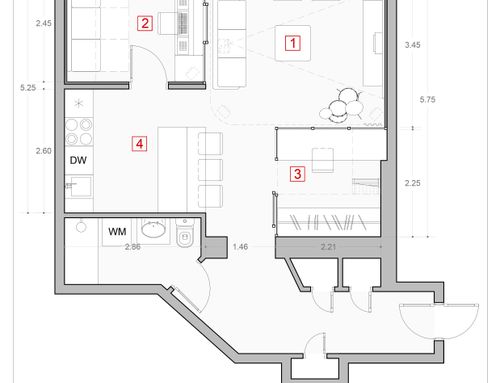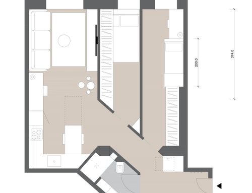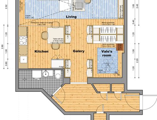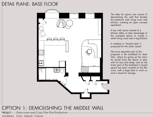 Después de una larga y dolorosa espera, reuní suficiente dinero para comprar una casa para mí y mi hijo de 3 años llamado Valo. Su nombre es como traducción directa: ligero. Eso es lo que más necesito. El piso no es grande, pero está ubicado en una zona que siempre me ha gustado llamada Kallio (Roca). Valo también ama la música y sus instrumentos favoritos son la batería y la guitarra. El piso está cerca de un parque llamado Bear Park. Finalmente logré nuestros objetivos, pero la ubicación soñada tiene un costo. El piso es de 51 metros cuadrados. Lo crea o no, en realidad es mucho en la escala de Helsinki. O escala de Kallio, siendo precisos. Me enamoré del piso, por la planta. Fue sencillo. Una gran sala de estar y una gran cocina. Eso es. Pero me han criticado porque estoy cumpliendo el sueño de un hombre soltero. Estoy en desacuerdo. Estoy segura de que podemos encontrar una buena división de ambientes con puerta de vidrio, por ejemplo, ya sabes, los que son populares en estos días. Primero pensé en dividir la cocina por la mitad, pero ahora incluso estoy pensando en cambiar toda la pared que divide la cocina de la sala de estar. Convertir esa pared en una puerta corrediza hecha de vidrio. De esa forma no perderemos ninguna ventana.