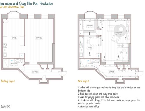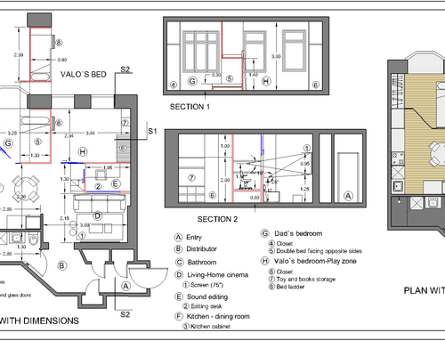 After a long painful wait I gathered enough money to by a home for me and my 3 years old son called Valo. His name is as straight translation -light. That's what I need the most. The Flat is not big, but it is located in area that I have always loved called Kallio (Rock). Valo loves music too and his favourite instruments are drums and guitar. The flat is close to a park called Bear Park. I finally achieved our goals, but dream location comes with a cost. The flat is 51 square meters. Believe it or not that is actually a lot in Helsinki scale. Or Kallio scale, being precise. I felt in love with the flat, because of the floor plan. It was simple. One big living room and a big kitchen. That's it. But I've been criticised that I'm fulfilling single mans' dream. I disagree. I'm sure we can come up with a good, for example glass door room divider, you know the ones that are popular these days. First I thought I'll just split the kitchen in half, but now I'm even thinking of changing the whole wall that divides the kitchen from living room. Turn that wall into sliding door made out of glass. That way we won't loose any windows. What people are wrong about is that my act is selfish. Actually not, because I saw a "huge room" full of potential for moving and playing and climbing. Even driving with a toy car that he loves. Maybe a treehouse like own room, but again I'm lazy. It would be nice if he could have his privacy after he goes to school as well, but an idea that could happen. Well this is not it. Music, music, music is his most powerful instrument of communication and while filmmaking is mine. I want to put these two together. At beginning I wanted to be able to do professional colour grading in the flat, now I want to to be able to play music with him without a concern about the noise and of course make it possible to do a professional sound mixing too (5.1). Not only me, but some close and intimate clients too. Acoustic treatment will make the flata bit smaller. What do you think, can I have all of this or just big dreams in a small flat? It sounds complicated, but I don't see a cheesy home cinema, but I see a home with 90--120 inch screen and a professional projector and 5.1 sound professional sound mixing abilities (“low” budget of course). In my mind I'm scared that I will loose the feel of space, that's why I want to have different hight differences for example for a "living room" or ugly editing desk that must face the screen. I don't know. I love colors and I need carpets. Deep Forest green, Deep Dark blue but respecting one hundred years old buildings traditions. Oh wait, I need a place to sleep. A closet bed will do :)