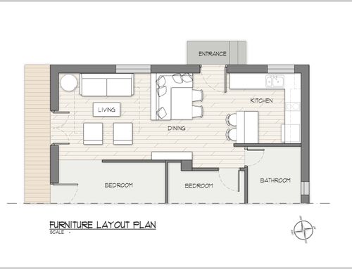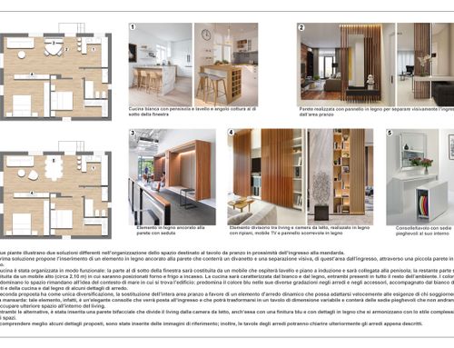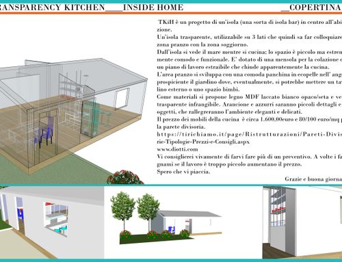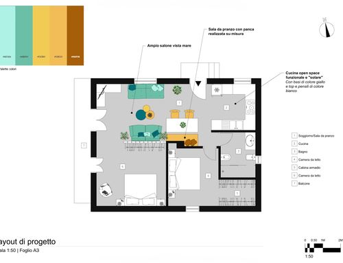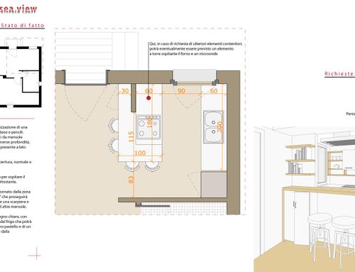 La casa, per quattro persone, è pensata per gran parte come open space: cucina, living vista mare e camera da letto principale, con queste ultime due separate non dal solito tramezzo ma da un divisorio vedo/non vedo che conterrà qualche libro, piante e oggetti. Il resto della casa è poi costituito da un'altra stanza da letto e un bagno con doccia. Il bianco verrà usato molto (alcuni mobili, porte, alcune pareti) e poi ci saranno colori, a partire dal divano (probabilmente una tonalità di blu o di arancio) e da alcune pareti (probabilmente tonalità di azzurro o arancio, anche a seconda della scelta finale dei rivestimenti del bagno che giocano sugli stessi colori). Il pavimento sarà chiaro, effetto legno.
