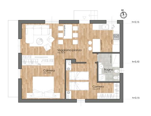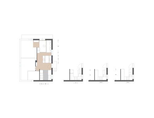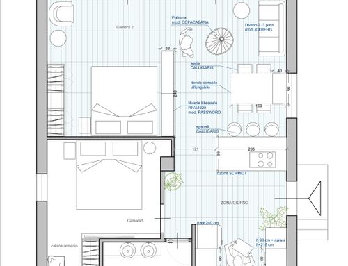The house, for four people, is mostly designed as an open space: kitchen, living room with sea view and main bedroom, with the latter two not separated from the usual partition wall but from a partition that it will contain some books, plants and objects. The rest of the house consists of another bedroom and a bathroom with shower. The white will be used a lot (some furniture, doors, some walls) and then there will be colors, starting from the sofa (probably a shade of blue or orange) and some walls (probably shades of blue or orange, also depending on the final choice of bathroom coatings that play on the same colors). The floor will be clear, wood effect.
