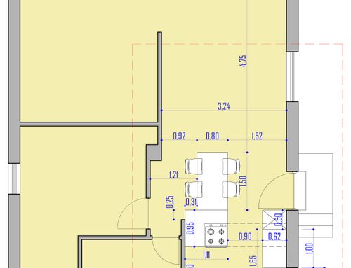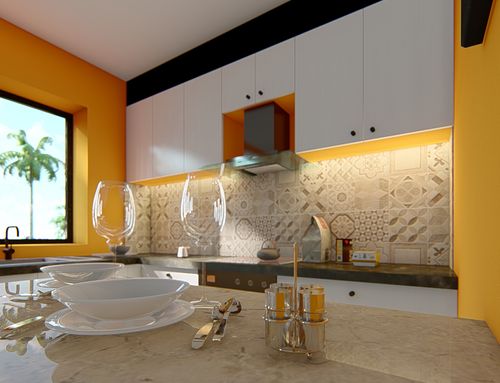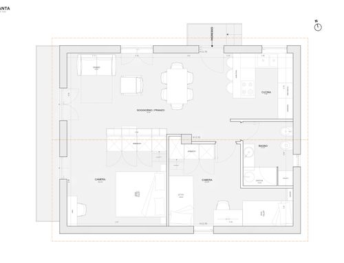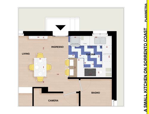 What I would like for this holiday home is a meeting between modern / minimal style, simplicity and colors that call to mind the summer (blue, orange, white). The contest concerns the organization of the kitchen spaces which is close to the entrance: due to the choices made to distribute the other rooms, that was the only place to be able to locate it.