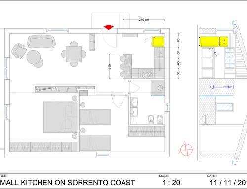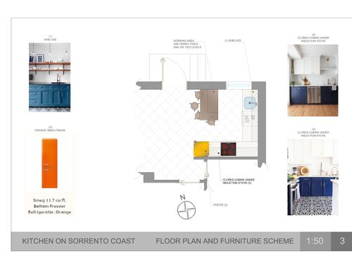 Ciò che vorrei per questa futura casa vacanze è un incontro tra stile moderno/minimal, semplicità e colori che ricordino l'estate (azzurro, arancio, bianco). Il contest riguarda l'organizzazione degli spazi della cucina che, ahimè, è a ridosso dell'ingresso: per le scelte fatte di distribuzione degli altri ambienti, quello era l'unico posto dove poterla localizzare.