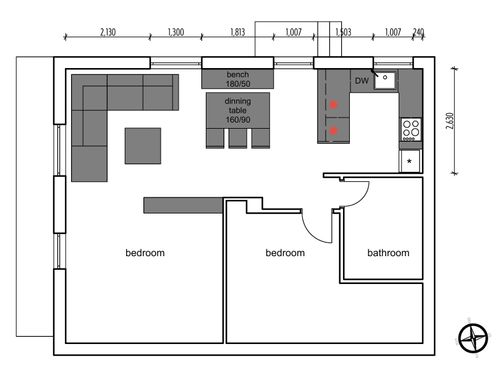 Some indications: I would like the sink under the window and that the kitchen includes an oven, an induction hob and an open fridge. I really like the idea of ​​the island or peninsula with fires and places to have lunch, maybe staggered, or a table with an L-shaped bench and the rest of the seats with normal chairs. But they are just ideas and I am open to any other solution ... I can't wait to see your projects !!