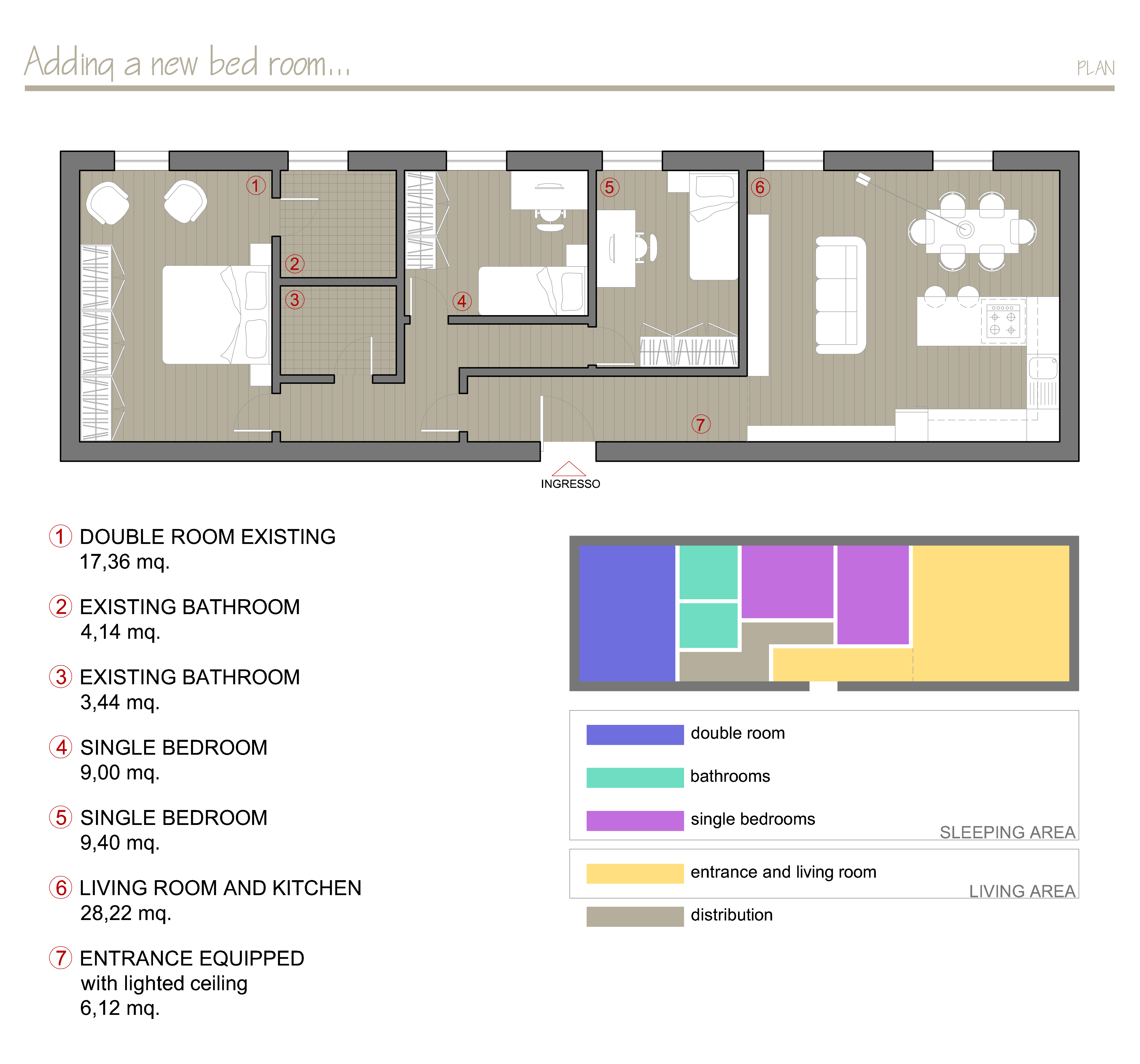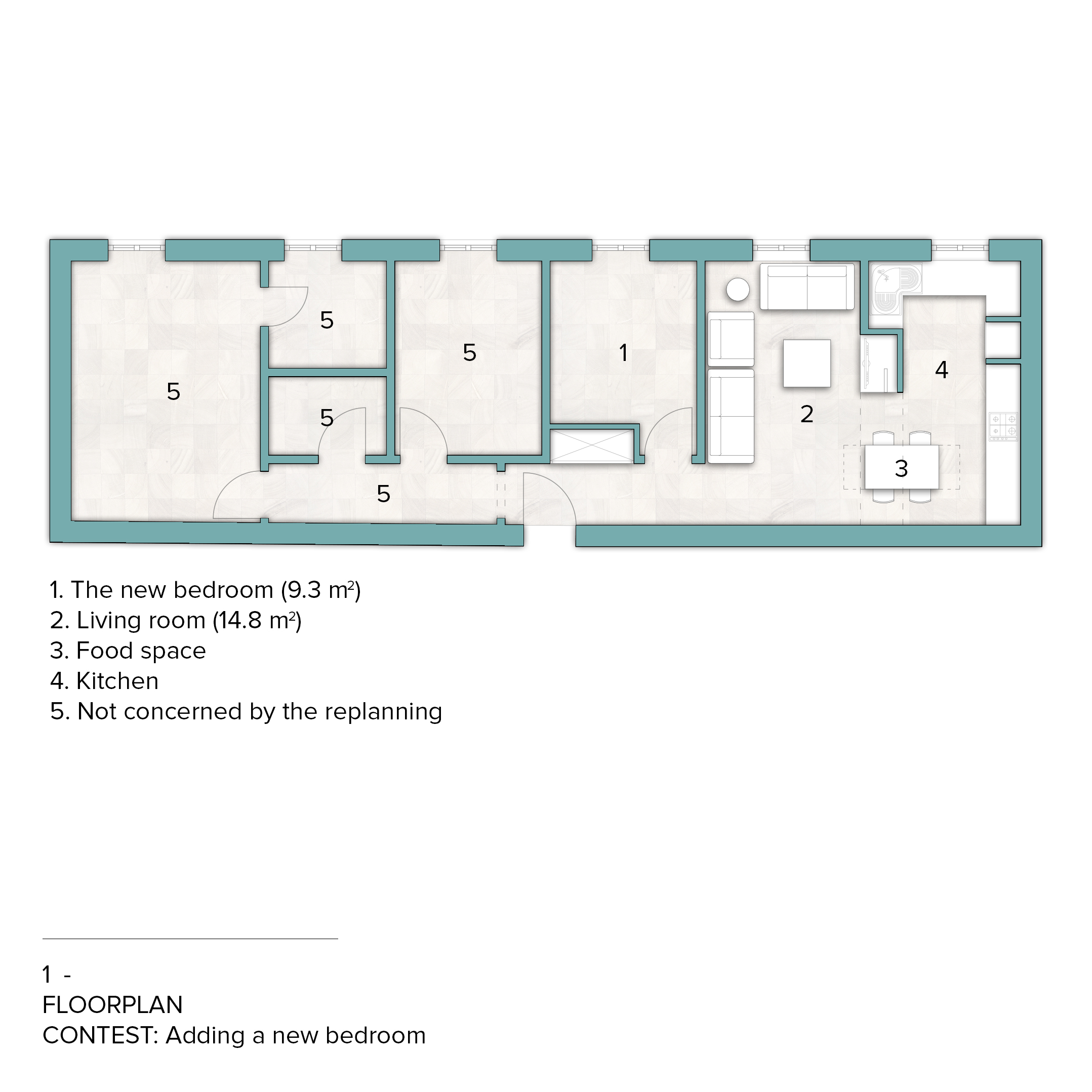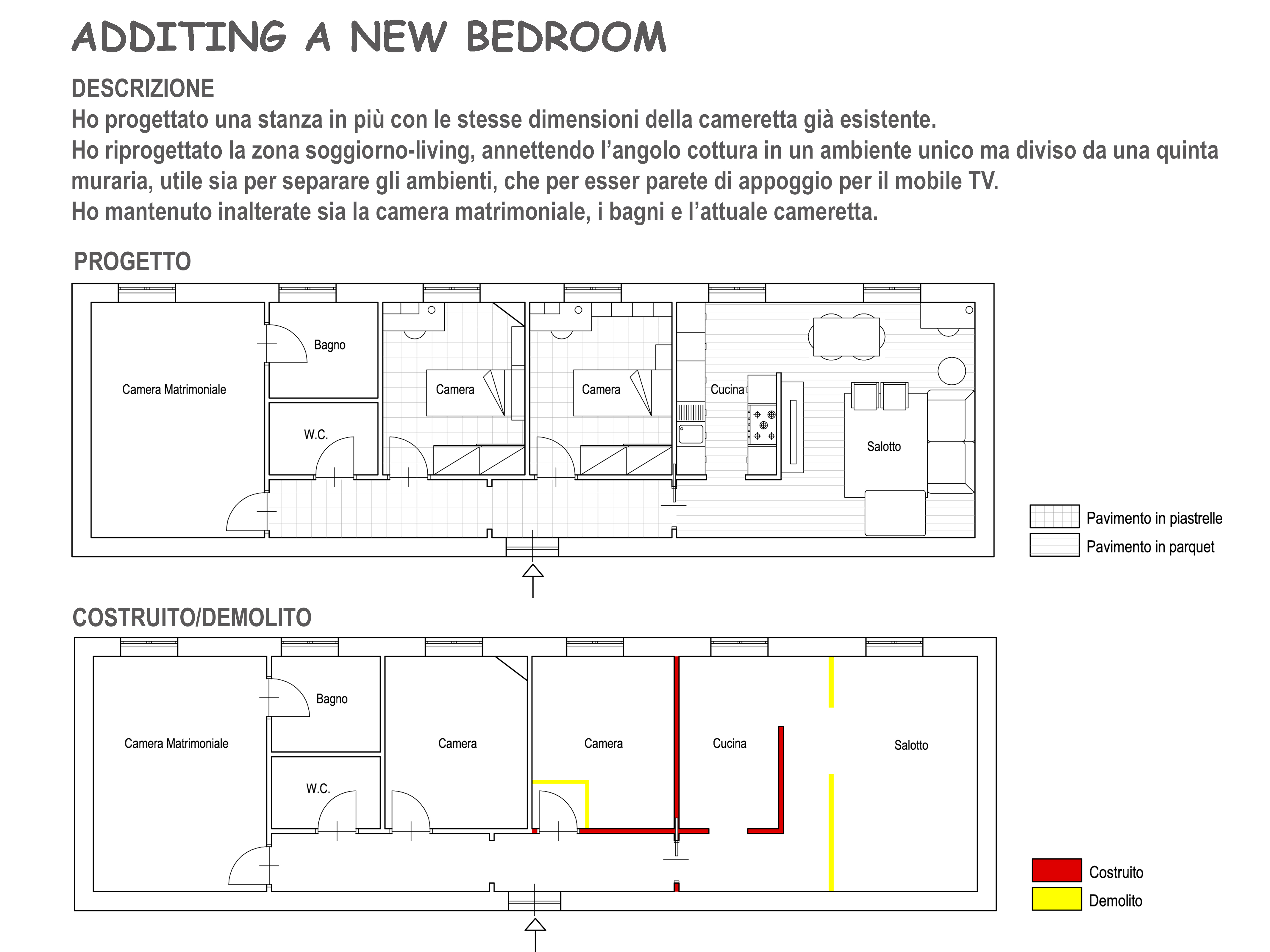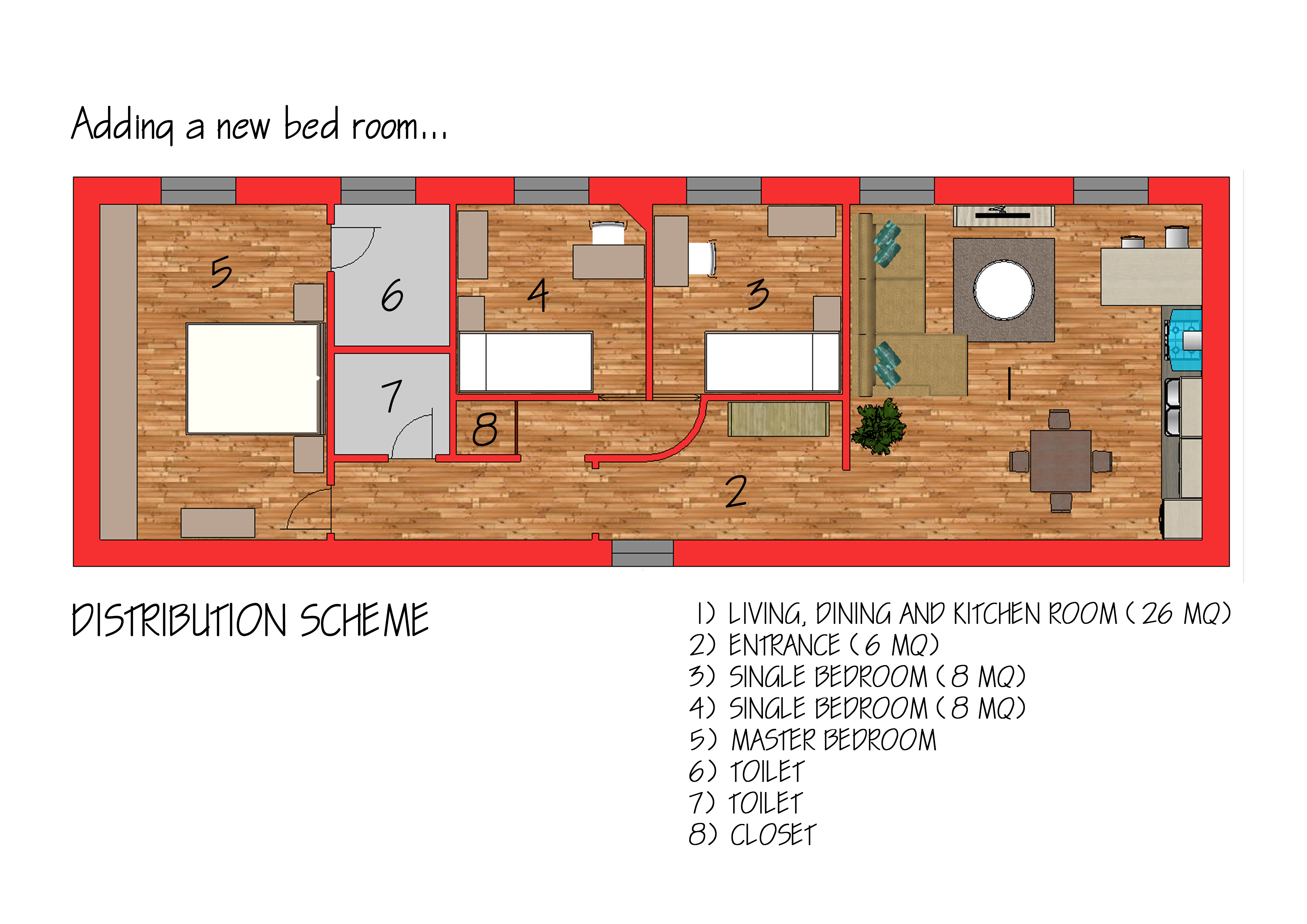 I would add a new bedroom for a child, creating an open kitchen in the living room or a small kitchen or any alternative feasible solution.