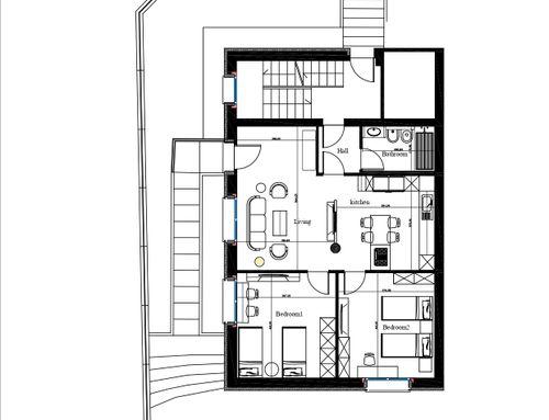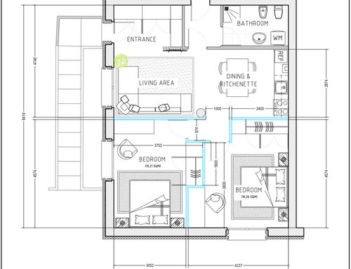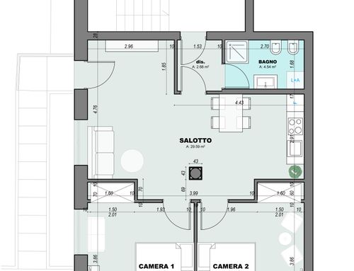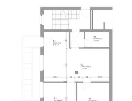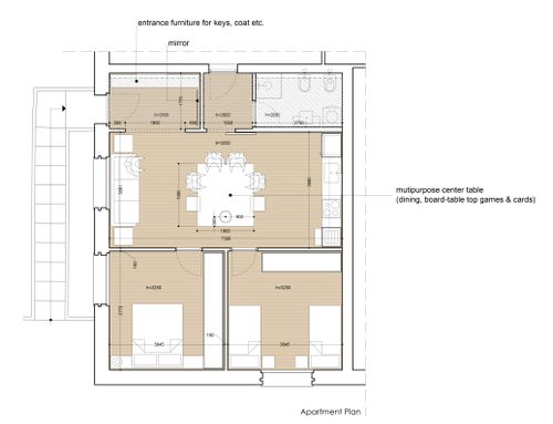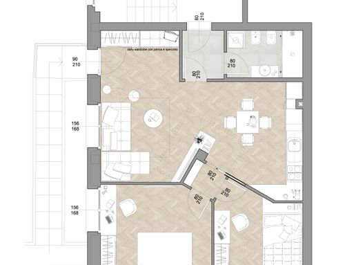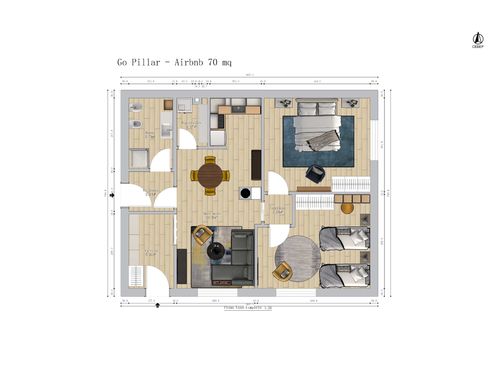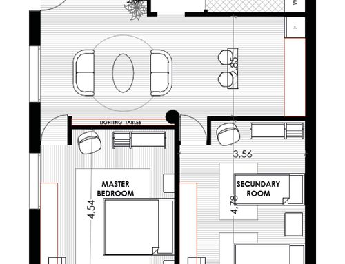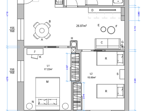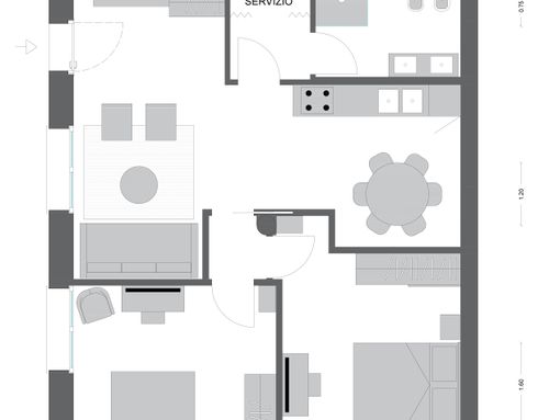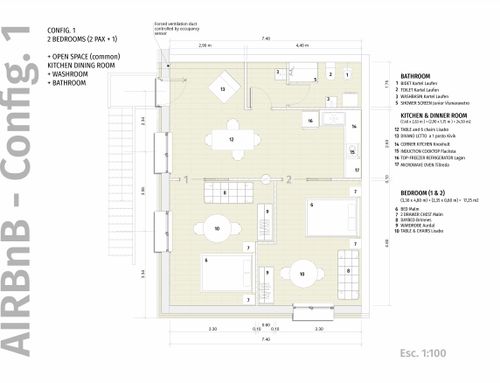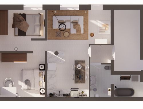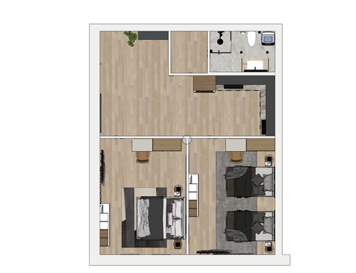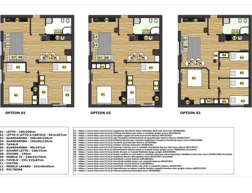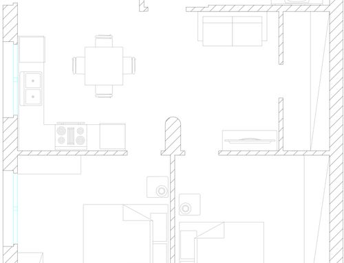 Following a renovation of a craft space (see the GoPillar project "exWorkshop - Open Space 170 sqm"), we now have an empty space from which we would like to create a small apartment to rent for short periods (the location is roughly equidistant from Milan and Lake Como). For commercial reasons, I believe it would be useful to create 4 sleeping spaces (two bedrooms) and a small kitchen. Since we are trying to make the most of the space (or at least cover the costs), the economy of the furnishings (and the overall solution) and its aesthetics will be very important. Just for your reference, in terms of our taste, we imagined a light laminate floor (perhaps bleached oak?) and have looked at Ikea furniture and some object from Maison du Monde. We generally prefer modern over classic (I think it will be useful to look at the original renovation project mentioned above for more precise ideas). If we had to chose colors we would say yellow, grey and wood. The only space already defined is the bathroom (see the drawing, though we still need to choose the furnishings for it), the rest is completely empty. The freehand drawing, of course, is the idea of non-professionals! There are 2 entrances: the one near the bathroom ideally will NOT be used by guests, who will access the apartment through the other entrance that leads directly to the courtyard. In the center of the apartment, there is a "disturbing" element: a metal "pillar" that cannot be removed...
