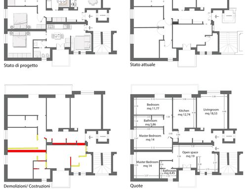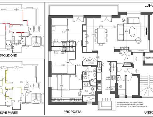 We would need to keep the service room to host a babysitter or to use it as a yoga / gym room. Finally, in the room located at the top right of the map there is a very nice bookcase / boiserie that we would like to keep (painting it white or making it more modern); however, if you wish, you can arrange for its temo al, reduci Toon or replacement. We would like to create built-in wardrobes in the corridors or at the entrance to make the most of the spaces. It would be ideal to create a storage room (1.5 m2) for my wife and children 'shoes. Finally, having the house two entrances, one wonders to imagine a solution for a future division into two independent mini apartments (1/2 and 1/2). Good job!