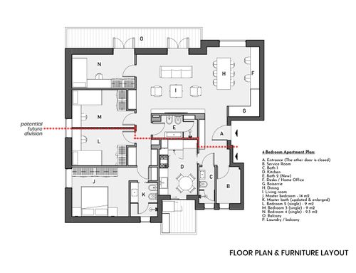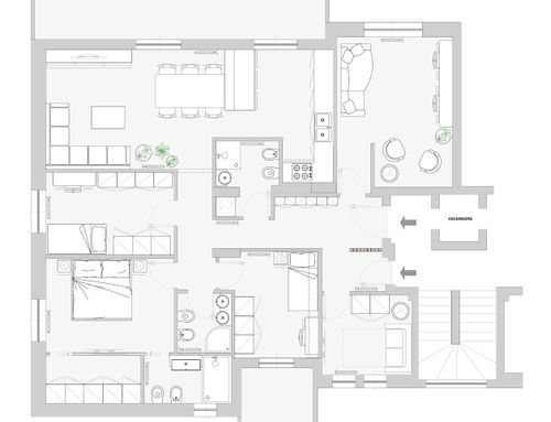 Avremmo bisogno di mantenere la stanza di servizio per ospitare una baby sitter oppure per adibirla a stanza per yoga/gym. In ultimo nella stanza che si trova in alto a destra della piantina c'è una libreria/boiserie molto bella che vorremmo conservare (pitturandola di bianco o rendendola più moderna). Tuttavia se volete potete anche prevederne la riduzione, la rimozione o lo spostamento. Ci piacerebbe creare degli armadi a muro nei corridoi o all'ingresso per sfruttare gli spazi il più possibile. Sarebbe ideale creare un ripostiglio (da 1,5 mq2) per le scarpe di mia moglie e dei miei figli. Infine, avendo la casa due ingressi, si chiede immaginare una soluzione per una futura suddivisione in due mini appartamenti indipendenti (1/2 e 1/2). Buon Lavoro!