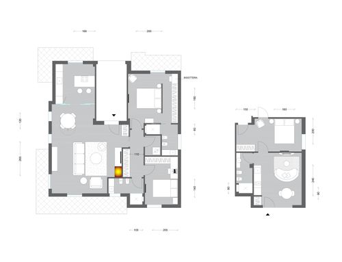 Attualmente la zona giorno è poco sfruttata anche a causa di un camino ingombrante (non da eliminare ma da ridurre) e del secondo bagno che prende molta metratura in quella che è la zona giorno.