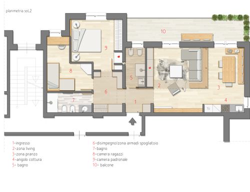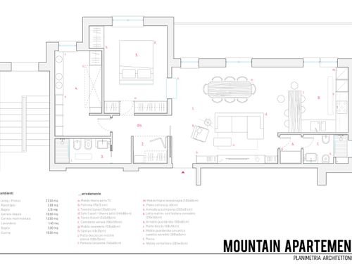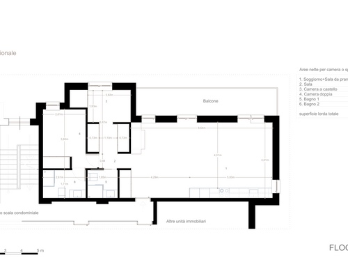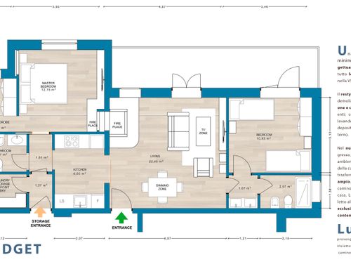 Zona giorno molto ampia, riducendo al minimo le camere, composta da cucina a vista su zona pranzo più zona TV. La zona giorno deve dare sul balcone.