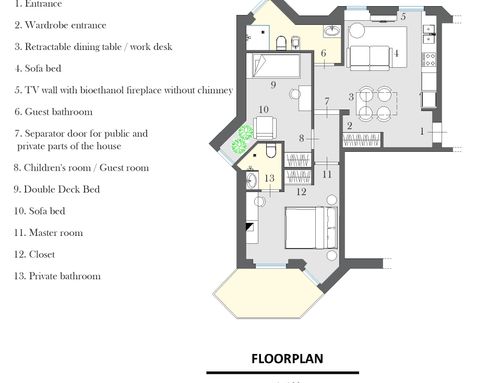 - Casa de vacaciones del propietario (pareja con 2 hijos): sala de estar/ cocina, baño/s, dormitorio principal (cama doble) y habitación de los niños con posible huésped (por lo tanto, 3 camas, 2 fijas y una también móvil)