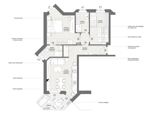 L'appartamento è ad uso investimento, quindi il budget e' abbastanza economico. Per gli arredi ad esempio e' consigliato indicare prodotti commerciali reperibili da catene. E' auspicabile ricorrere il meno possibile a soluzioni custom se non economiche da realizzare.