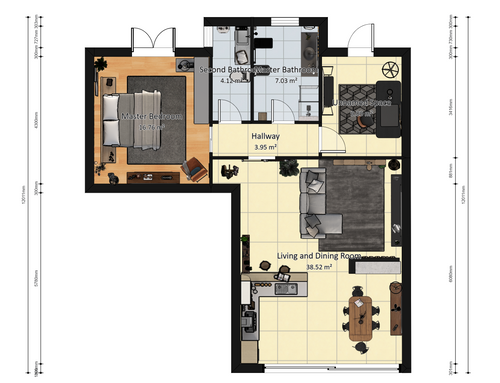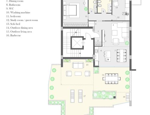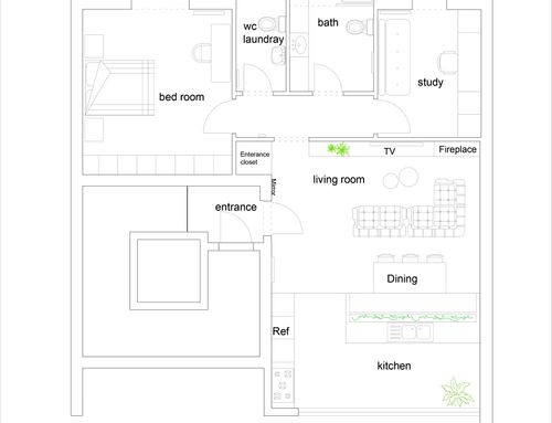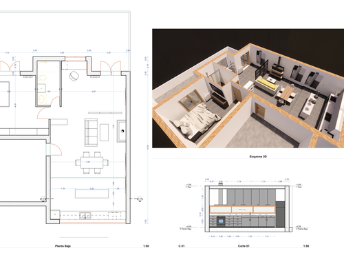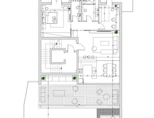 Andria. El apartamento está ubicado en Andria (Barletta Andria Trani) y se compone principalmente de una sola habitaciĂłn que contendrá la sala de estar y la cocina detrás de una gran ventana corredera que da a una gran terraza. Actualmente hay una pared con una puerta francesa doble y una simple que se moverá hacia el exterior e incorporará la nueva ventana. Más o menos en el centro de este salĂłn/comedor hay un escalĂłn, un desnivel, de unos 10 -12 centĂmetros correspondiente a la zona gris del plano, sobre el que nos gustarĂa crear el rincĂłn de la cocina posiblemente con una lado cercano al escalĂłn y la sala de estar que tiene la posibilidad de insertar una penĂnsula con taburetes que pueden hacer que las habitaciones se "comunican" de una manera elegante. Dentro de este entorno tengo la posibilidad de decidir dĂłnde instalar el radiador/calefacciĂłn. El dormitorio y el estudio tienen balcones, baño y baño principal, en cambio, ventanas. El baño principal tambiĂ©n se ampliará a las medidas del plano de planta. Nos gusta mucho la idea de un apartamento moderno, en un estilo minimalista pero elegante. TambiĂ©n imaginamos, posiblemente, una chimenea decorativa y una pared (o insertos) con revestimiento de piedra. Nos gustan los colores oscuros, las alfombras contrastantes y las lámparas decorativas. La casa es muy luminosa y nos gustarĂa mantener esta caracterĂstica.