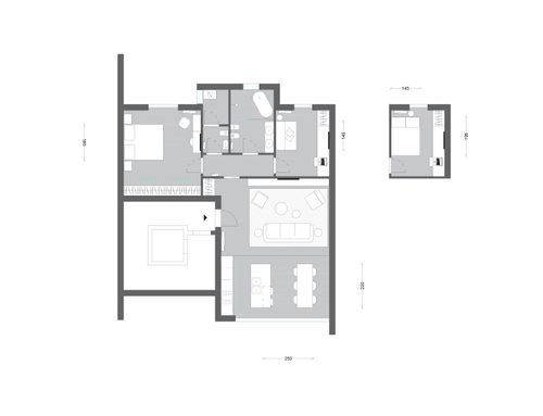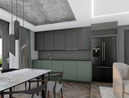 Andria. The apartment is located in Andria (Barletta Andria Trani) and is mainly composed of a single room that will contain the living room and the kitchen behind a large sliding window overlooking a large terrace. Currently there is a wall with a double and a single French door that will be moved outside and will incorporate the new window. More or less in the center of this living / dining room there is a step, a difference in height, of about 10 - 12 centimeters corresponding to the gray area of ​​the plan, on which we would like to create the kitchen corner possibly with one side close to the step and the living room that has the possibility of inserting a peninsula with stools that can make the rooms "communicate" in an elegant way. Within this environment I have the possibility to decide where to install the radiator / heating. Bedroom and study have balconies, toilet and main bathroom, instead, windows. The main bathroom will also be enlarged to the measurements from the floor plan. We really like the idea of ​​a modern apartment, in a minimal but elegant style. We also imagine, possibly, a decorative fireplace and a wall (or inserts) with stone cladding. We like dark colors, contrasting carpets and decorative lamps. The house is very bright and we would like to keep this feature.