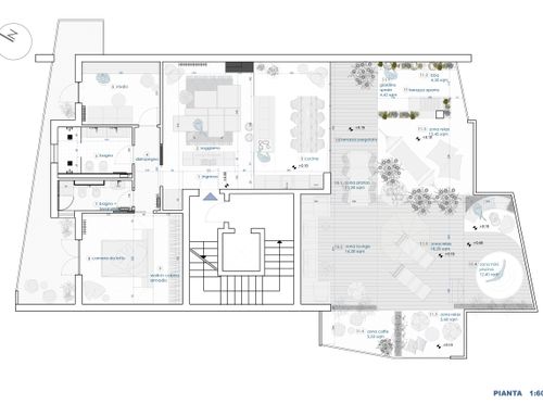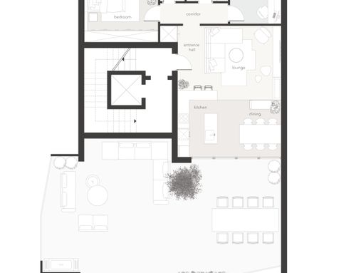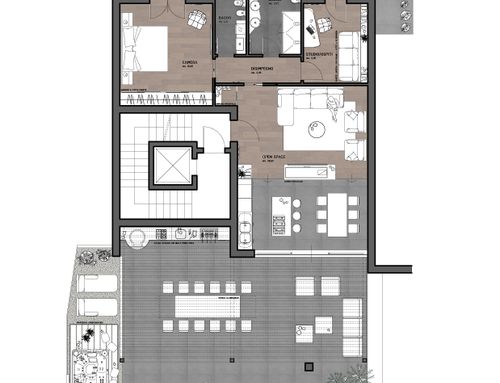 Andria. L'appartamento si trova ad Andria (Barletta Andria Trani) ed è composto principalmente da un unico ambiente che conterrà il soggiorno e la cucina a ridosso di una grande vetrata scorrevole prospiciente un grande terrazzo. Attualmente c'è un muro con una porta finestra doppia e una singola che verrà spostato all'esterno e ingloberà la nuova vetrata. Più o meno al centro di questa stanza soggiorno/pranzo è presente un gradino, un dislivello, di circa 10 -12 centimetri circa corrispondente all'area grigia della planimetria, sul quale vorremmo creare appunto l'angolo cucina possibilmente con un lato a ridosso del gradino e del soggiorno che abbia la possibilità di inserimento di una penisola con sgabelli che possa far "comunicare" in maniera elegante gli ambienti tra loro. All'interno di questo ambiente ho la possibilità di decidere dove installare il termosifone/riscaldamento. Camera da letto e studio hanno balconi, Wc e Bagno principale finestre. Anche il bagno principale verrà allargato alle misure da planimetria. Ci piace molto l'idea di un appartamento moderno, in stile minimal ma elegante. Immaginiamo anche, possibilmente, un camino d'arredo e un muro (o inserti) con rivestimento in pietra. Ci piacciono i colori scuri, i tappeti a contrasto e le lampade d'arredo. La casa è molto luminosa e vorremmo conservare questa caratteristica.