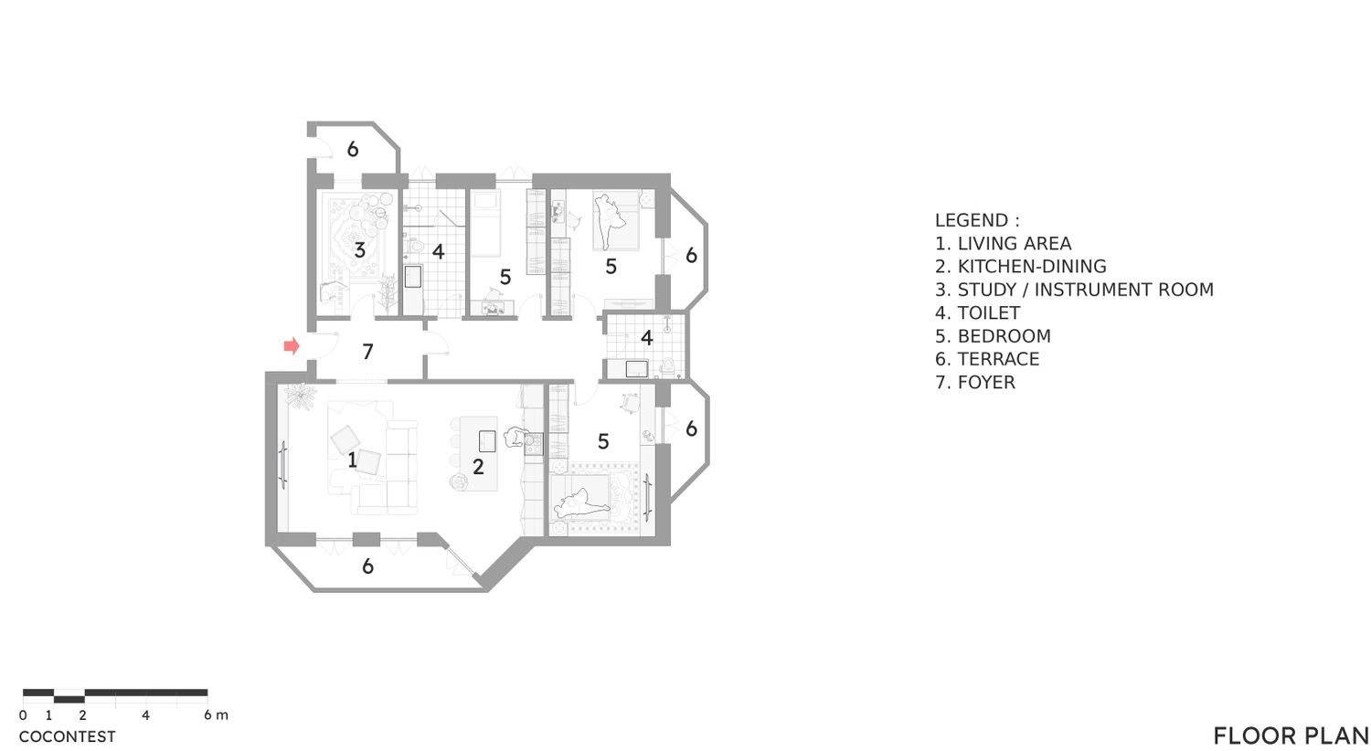 The instrument/study room switched with kitchen, so that kitchen/pantry merge with living room.