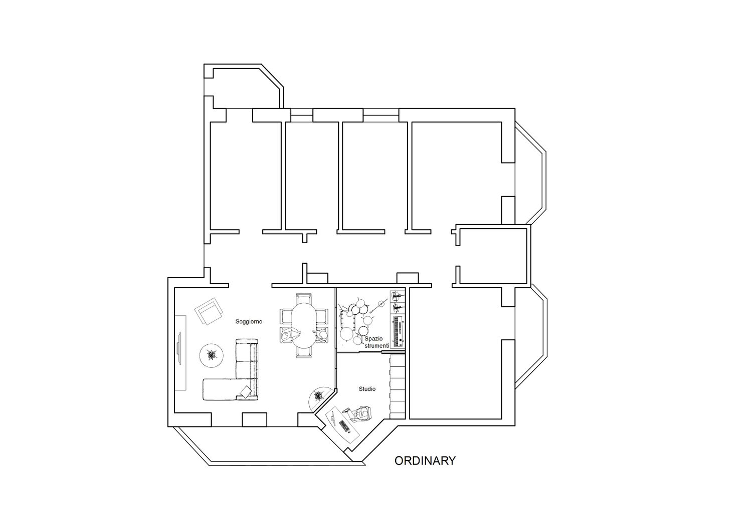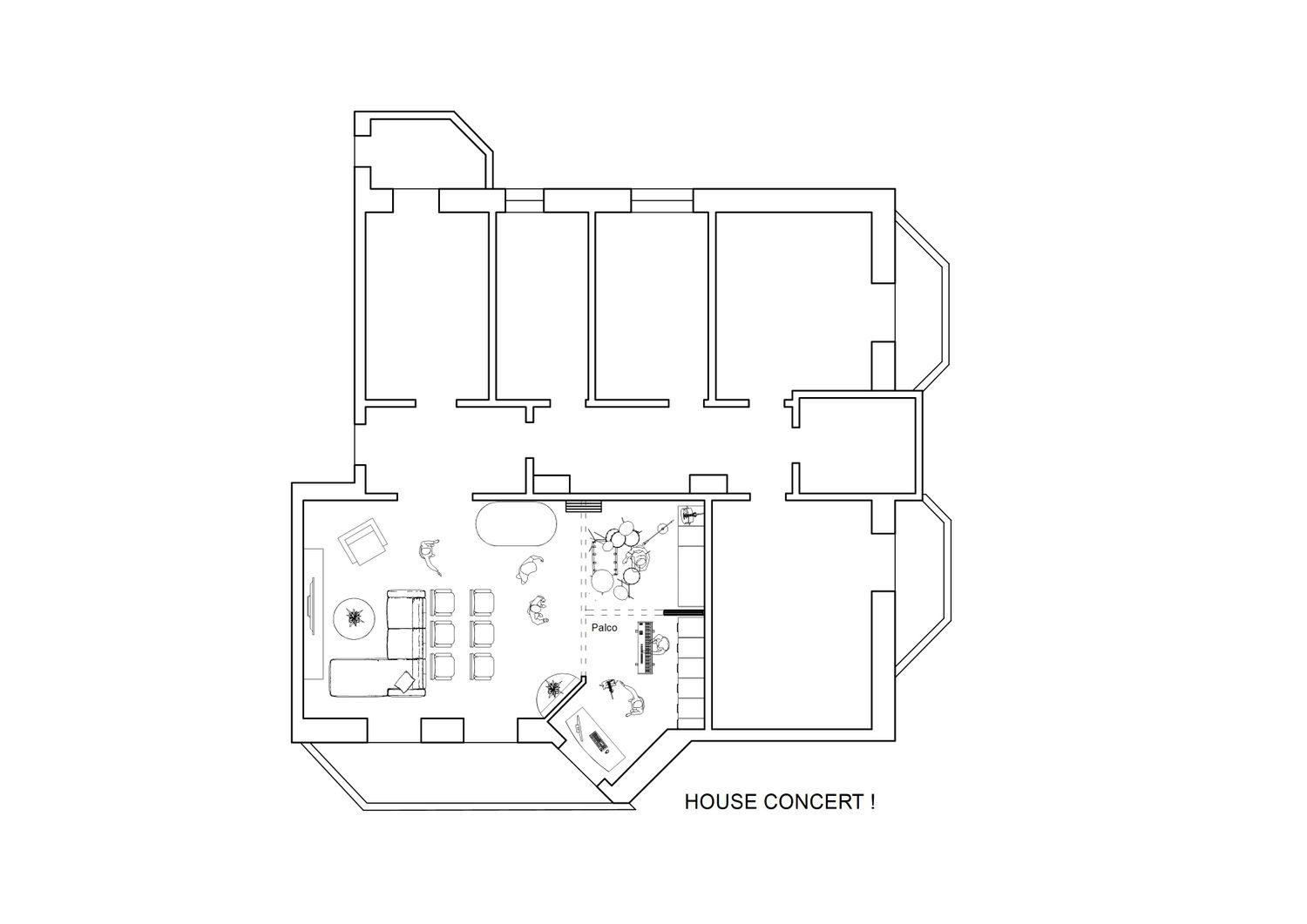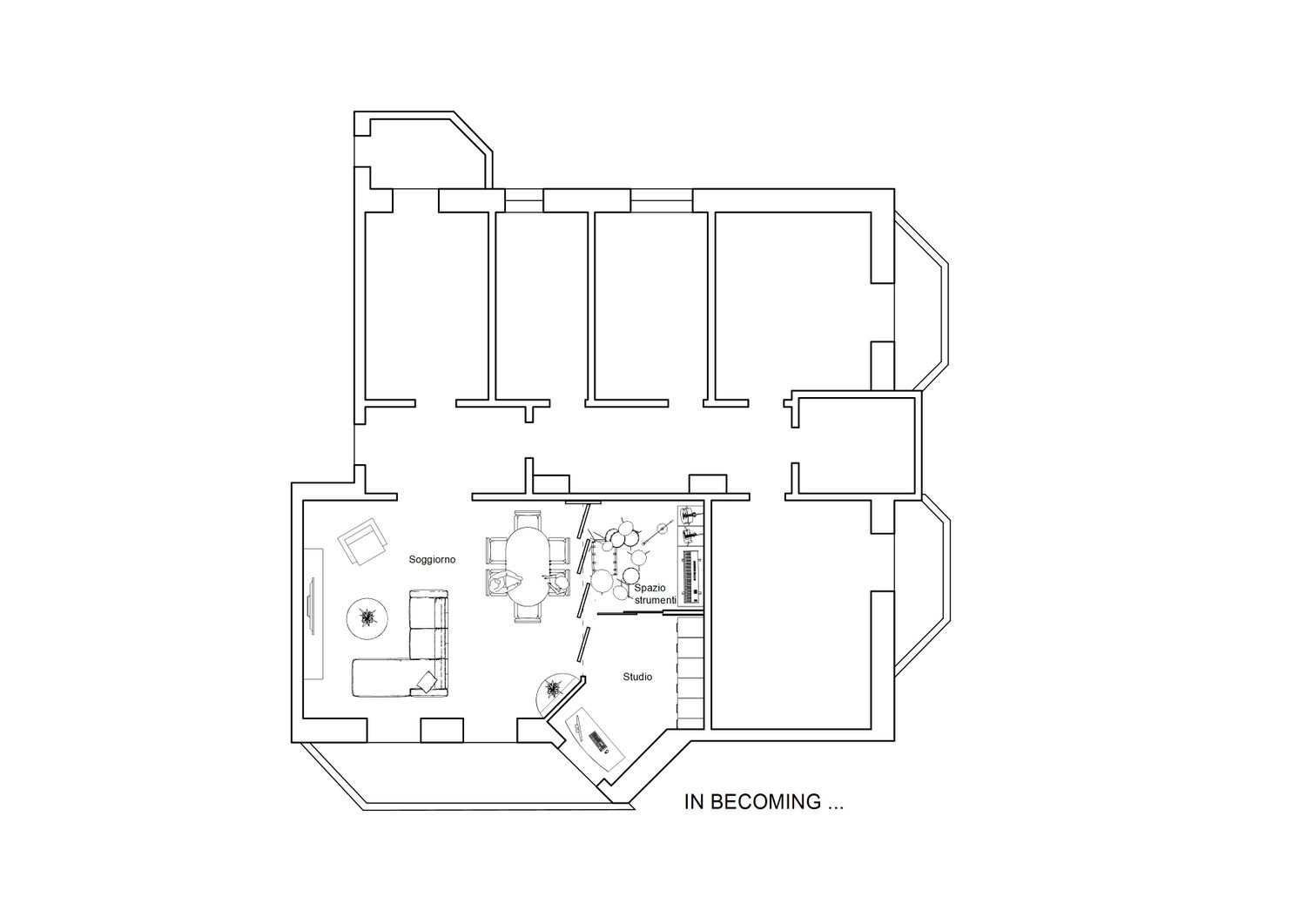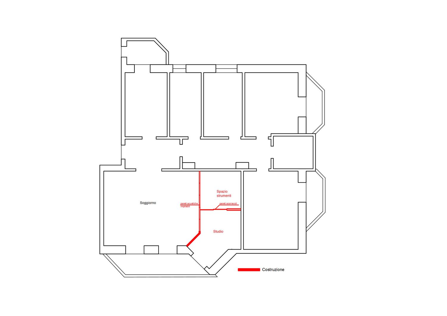 La proposta progettuale presenta una soluzione priva di demolizioni, ricavando uno spazio modulabile all'occorrenza tramite pannelli acustici impilabili, permettendo di avere uno spazio studio e strumenti separati e in momenti più conviviali trasformando questo spazio in un vero e proprio palco.
