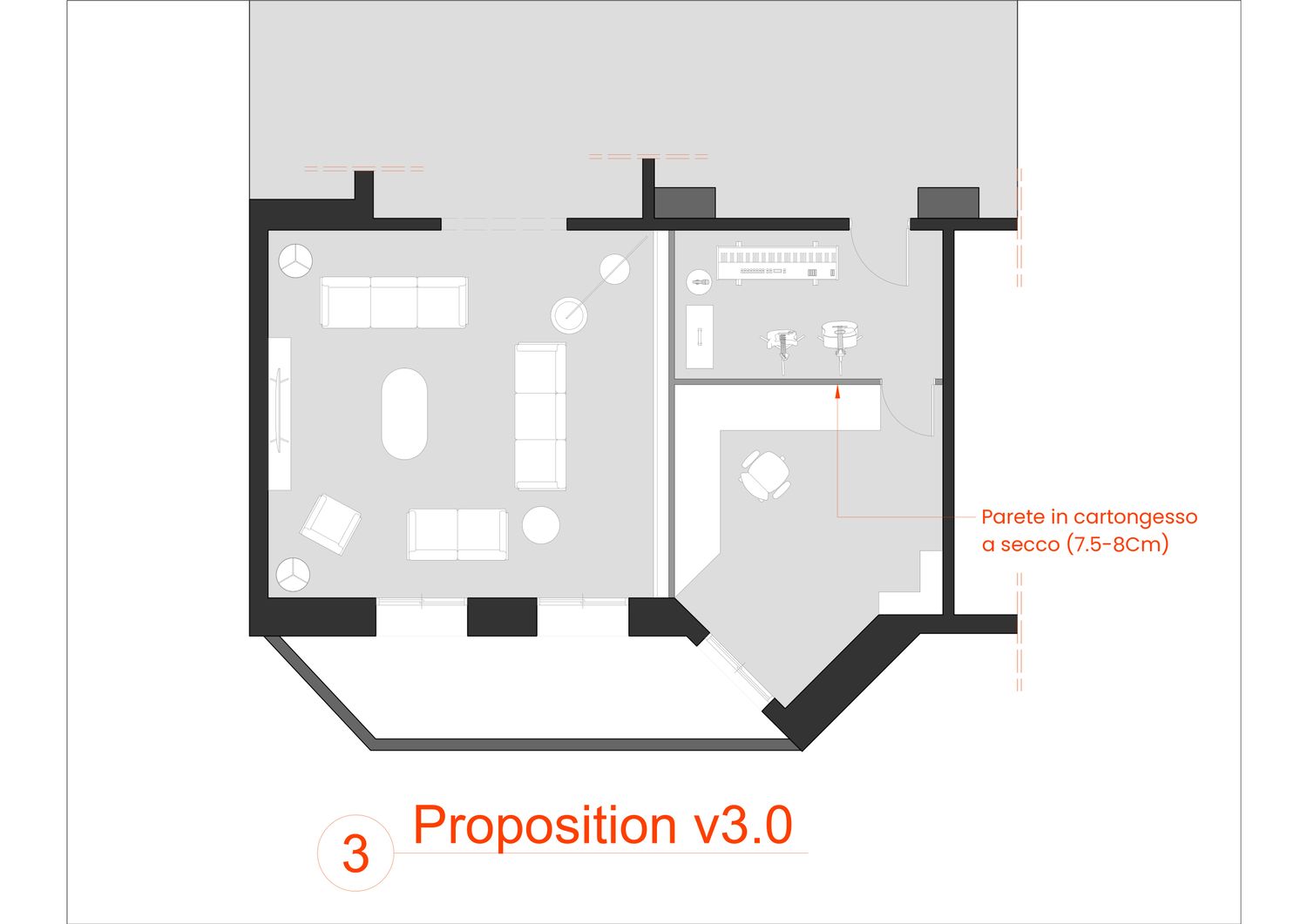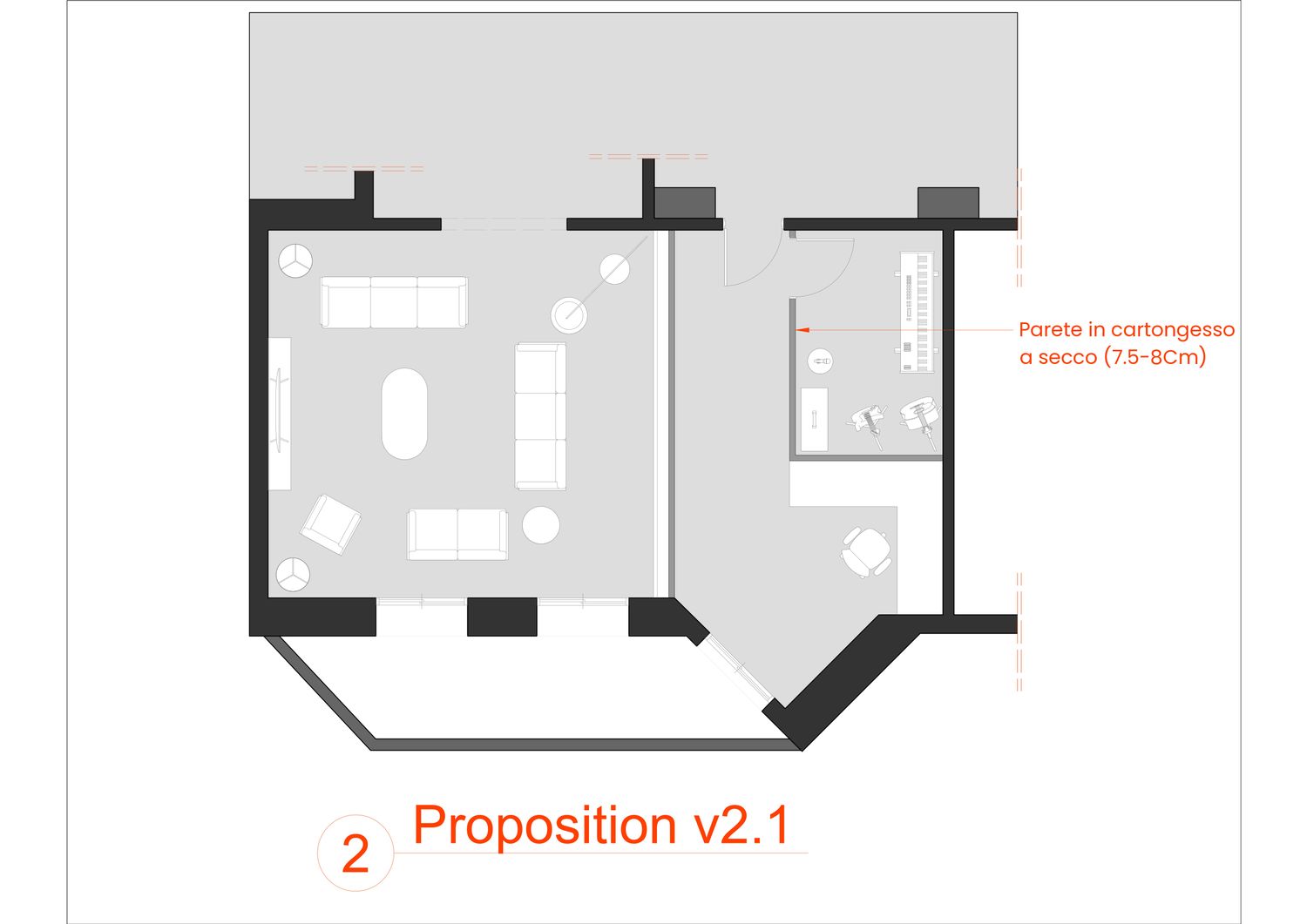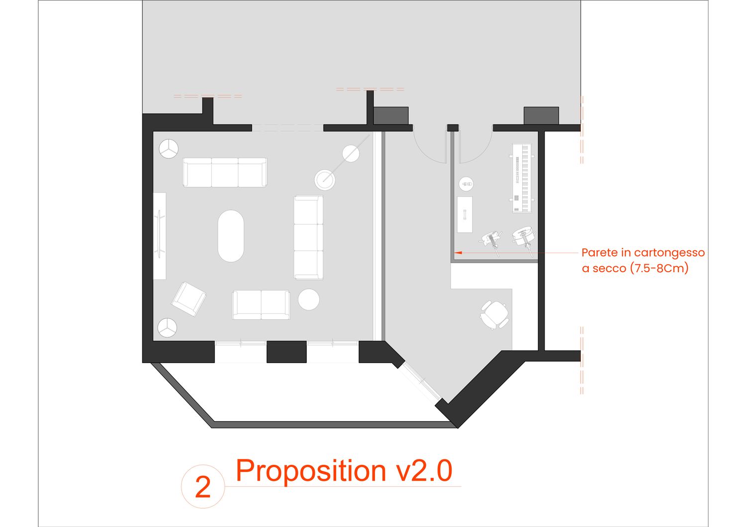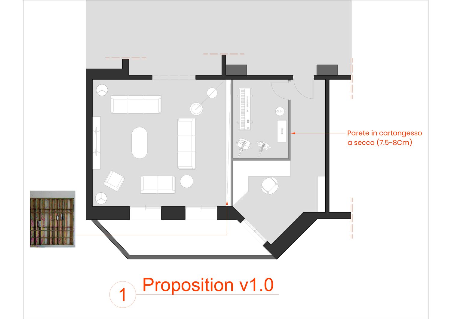 For the design, since it was not possible to demolish the wall or the building, we used a gypsum board wall (7.5–8 cm thickness). This solution allows us to keep the existing parquet without changes, maintain the same materials, and ensures that the partition can be easily removed in future projects without leaving any trace in the building. With this wall thickness, it is also possible to install a door, making the design fully feasible.