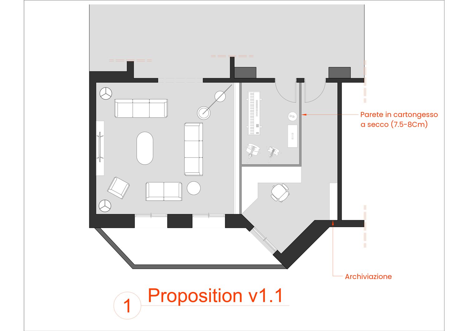"Prima Variante": Ho progettato un’area dedicata agli strumenti musicali, comprensiva di uno spazio per le esibizioni, accanto a una zona funzionale per il lavoro smart. Lo spazio di lavoro beneficia della luce naturale proveniente dalla finestra francese, che offre anche accesso diretto alla terrazza.