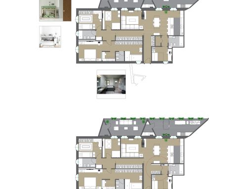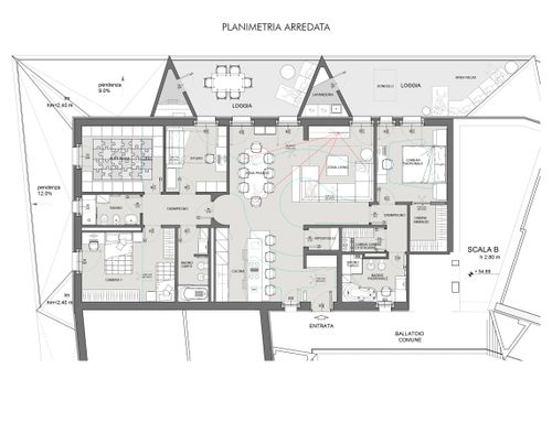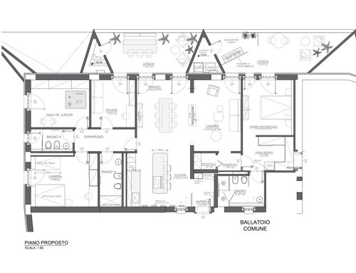 I would like to create a bespoke furniture (it is also good in plasterboard) between the dining area and the sofa area with TV that rotates between the two areas. I would also like to knock down the upper portion of the wall on the part above the fancoil and create an elegant custom-made furniture in plasterboard that creates a passage of light between the two rooms. I would like to replace the fancoil currently present on the joining wall of the two housing units on the B205 side with a design / furniture one. On the remaining part of the wall on the lounge / sofa side I would like to create a PC support surface and electronic accessories from which to start a stereo system with double zone (sitting and dining area).