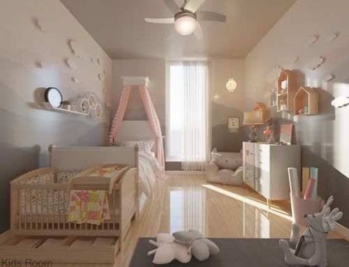 I would like to make a double room for the bedroom indicated with the number “1” for my 7 year old daughter and my 4 year old son. In a few years I would like to turn it into a single for my daughter. We need to select furniture that should not be replaced in a few years. I would like to provide a queen size bed for my daughter and a small transitional bed for the child. Soft colors that can be adapted to a girl's room in a few years.