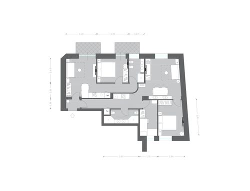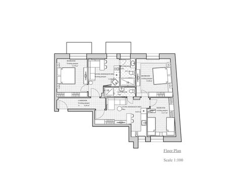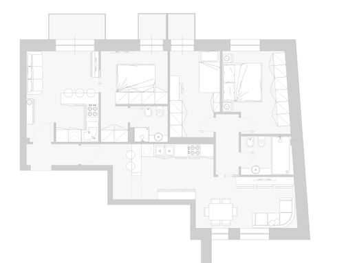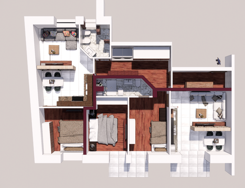 I have a 90sqm apartment in the center of Castellammare di Stabia, a seaside tourist town in the province of Naples, and I would like to build two small holiday homes. In every house I would like a living area with kitchenette, a comfortable sofa bed, a double bedroom and a toilet with shower. If it is possible, in one of the two houses I would like to create a second small bedroom where I can place two single beds or a bunk bed. In the apartment there is a mahogany parquet that I will have smoothed and polished. In the two existing bedrooms, as seen in the photo, there is a lighter wood frame and in the center the wood is positioned in a herringbone pattern. Currently the smaller toilet has a window but as you can see in the photo, it takes up a lot of space from the bedroom making it very small and uncomfortable and for this reason one of the two toilets, in the new project, can also have no windows. more space in the room.