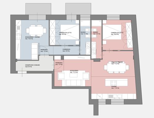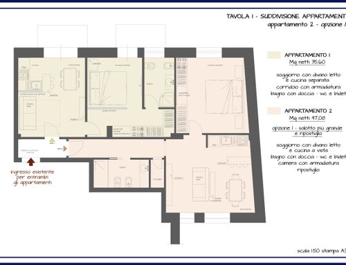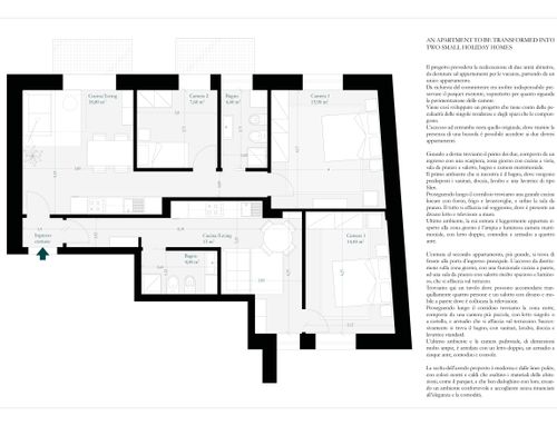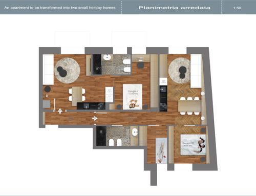 Ho un appartamento di 90mq al centro di Castellammare di Stabia, una città turistica di mare in provincia di Napoli, e vorrei ricavarne due piccole case per vacanze. In ogni casa vorrei una zona living con angolo cottura, un comodo divano letto, una camera da letto matrimoniale ed un wc con doccia. Se è possibile, in una delle due case vorrei ricavare una seconda piccola camera da letto dove poter inserire due letti singoli o un letto a castello. Nell'appartamento c'è un parquet in legno di Mogano che farò levigare e lucidare. Nelle due camere da letto esistenti, come si vede in foto, c'è una cornice in legno più chiaro ed al centro il legno è posizionato a spina di pesce. Attualmente il wc più piccolo ha una finestra ma da come si può vedere in foto, prende molto spazio dalla camera da letto rendendola molto piccola e scomoda e per questo motivo uno dei due wc, nel nuovo progetto, può anche non avere finestre così da dare più spazio alla camera.