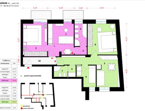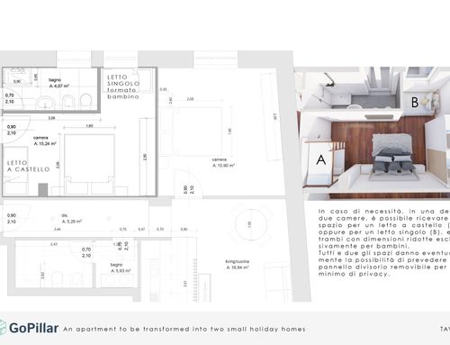 Tengo un apartamento de 90 m2 en el centro de Castellammare di Stabia, una ciudad turística junto al mar en la provincia de Nápoles, y me gustaría construir dos pequeñas casas de vacaciones. En cada casa me gustaría una sala de estar con cocina, un cómodo sofá cama, un dormitorio doble y un inodoro con ducha. Si es posible, en una de las dos casas me gustaría crear un segundo dormitorio pequeño donde pueda colocar dos camas individuales o una litera. En el apartamento hay un parquet de madera de caoba que habré lijado y pulido. En los dos dormitorios existentes, como se ve en la foto, hay un marco de madera más claro y en el centro la madera está colocada en forma de espiga. Actualmente el baño más pequeño tiene ventana pero como se puede ver en la foto ocupa mucho espacio del dormitorio por lo que es muy pequeño e incómodo y por esta razón uno de los dos baños, en el nuevo proyecto, tampoco puede tener ventanas para dar más espacio en la habitación.
