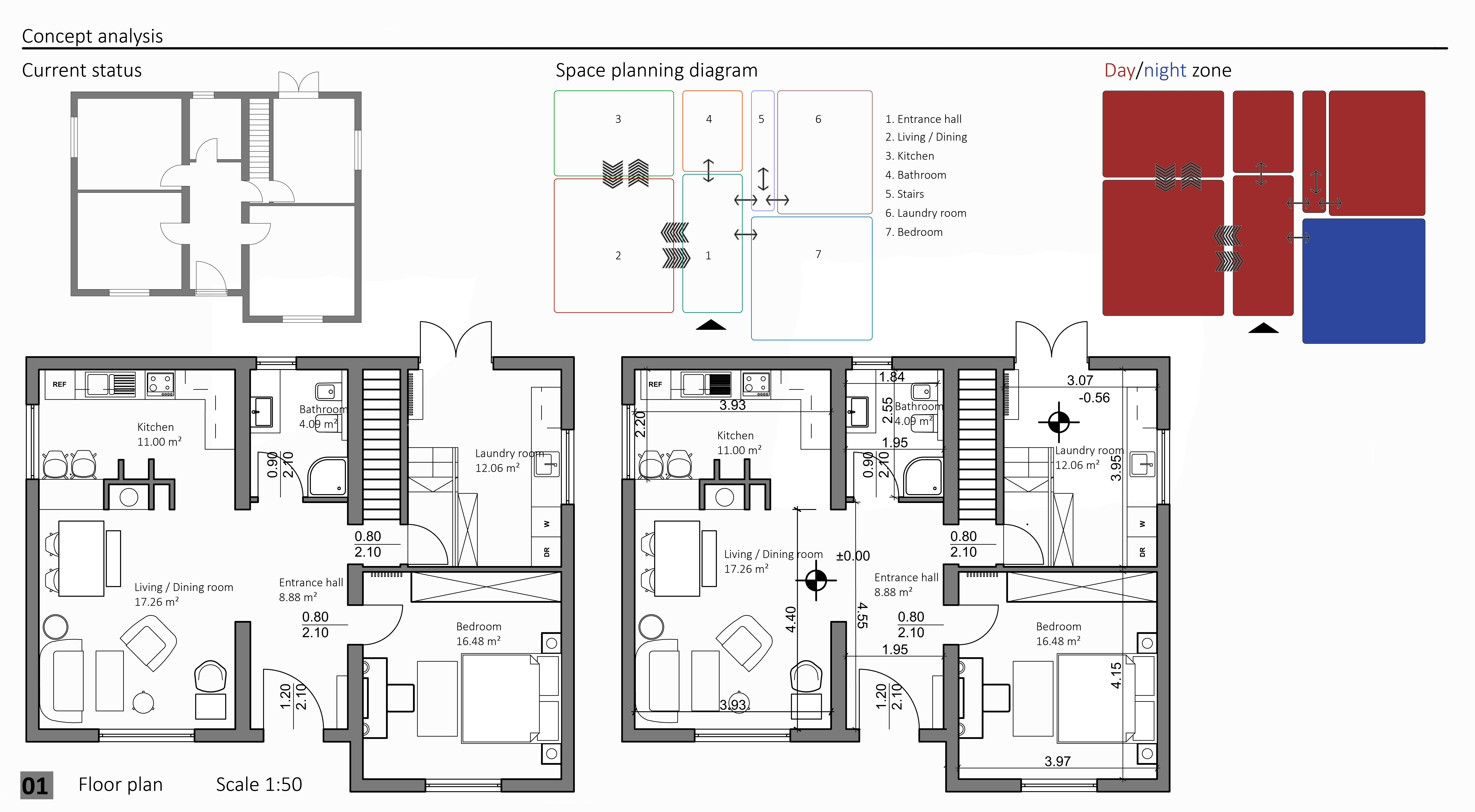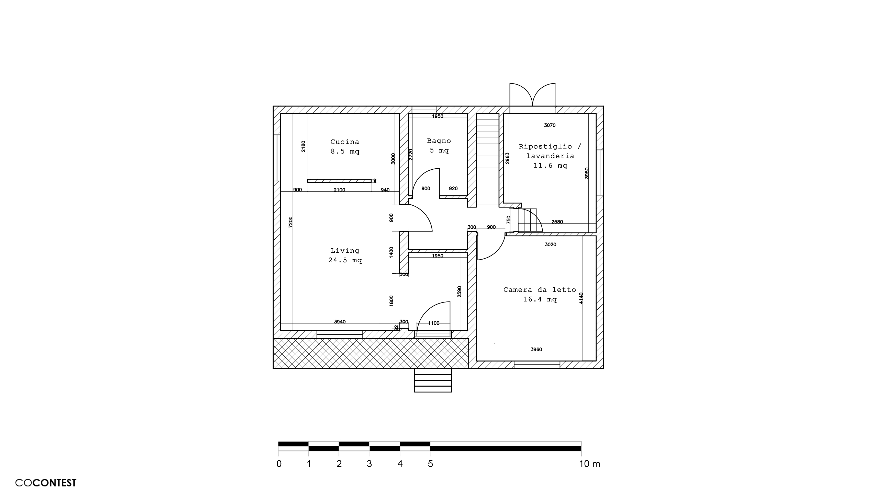 Stanza multiuso: nella stanza in alto a destra, con acceso diretto dall’esterno, vorrei ricavare una stanza multifunzione da utilizzare come lavanderia, dispensa, etc.. Sotto la scala verrà posizionata la caldaia a gas, per integrare il riscaldamento della stufa a legna. La scala deve essere mantenuta così com’è, anche se so che è molto stretta..