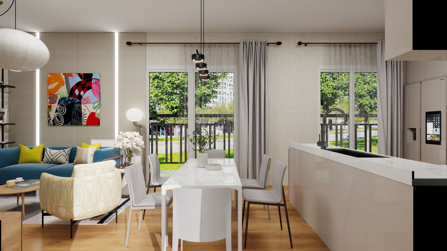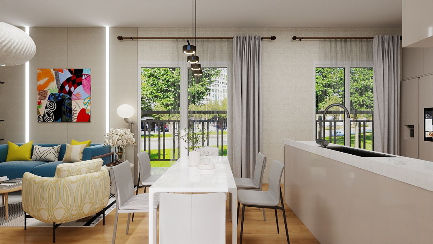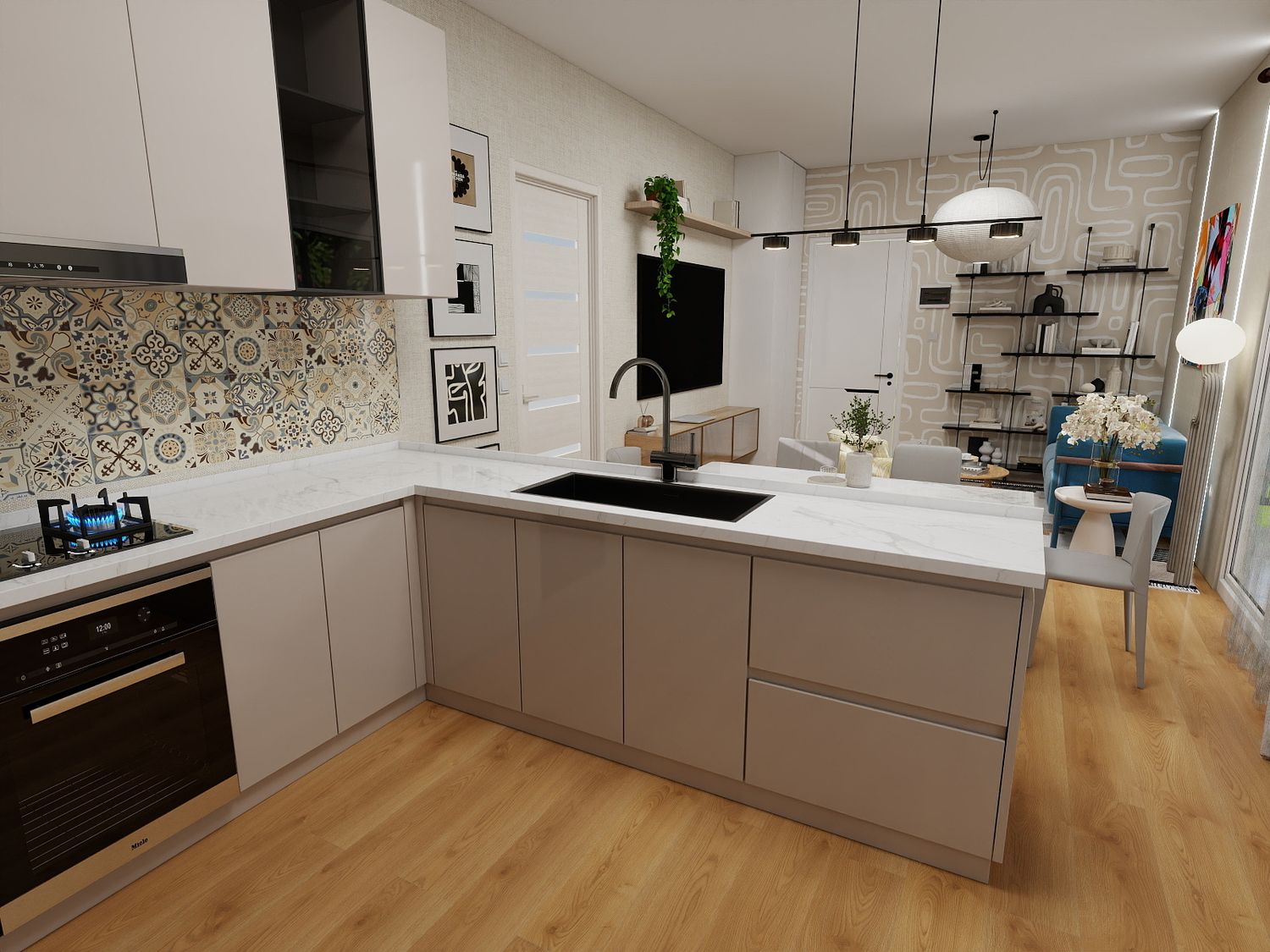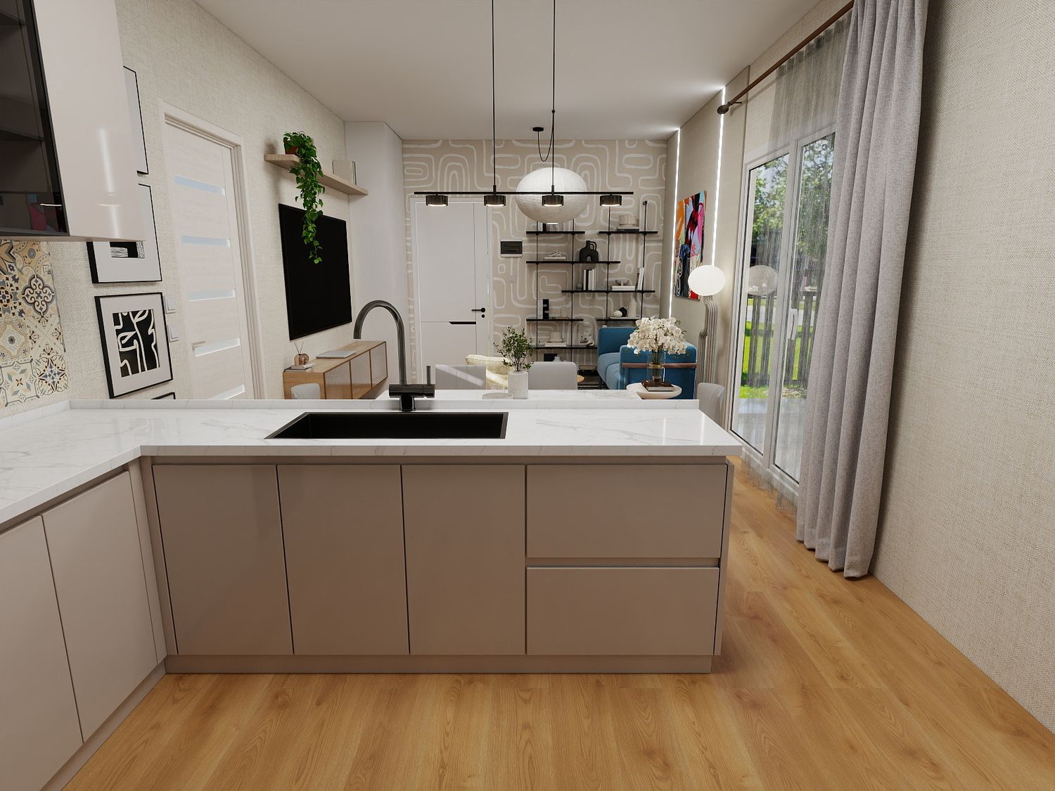 First, I decided to replace the blue tones with softer shades of beige and white. These colors work better with the kitchen elements, including the cabinets and tiles, and they also complement the sofa in the open living area and the dining table.