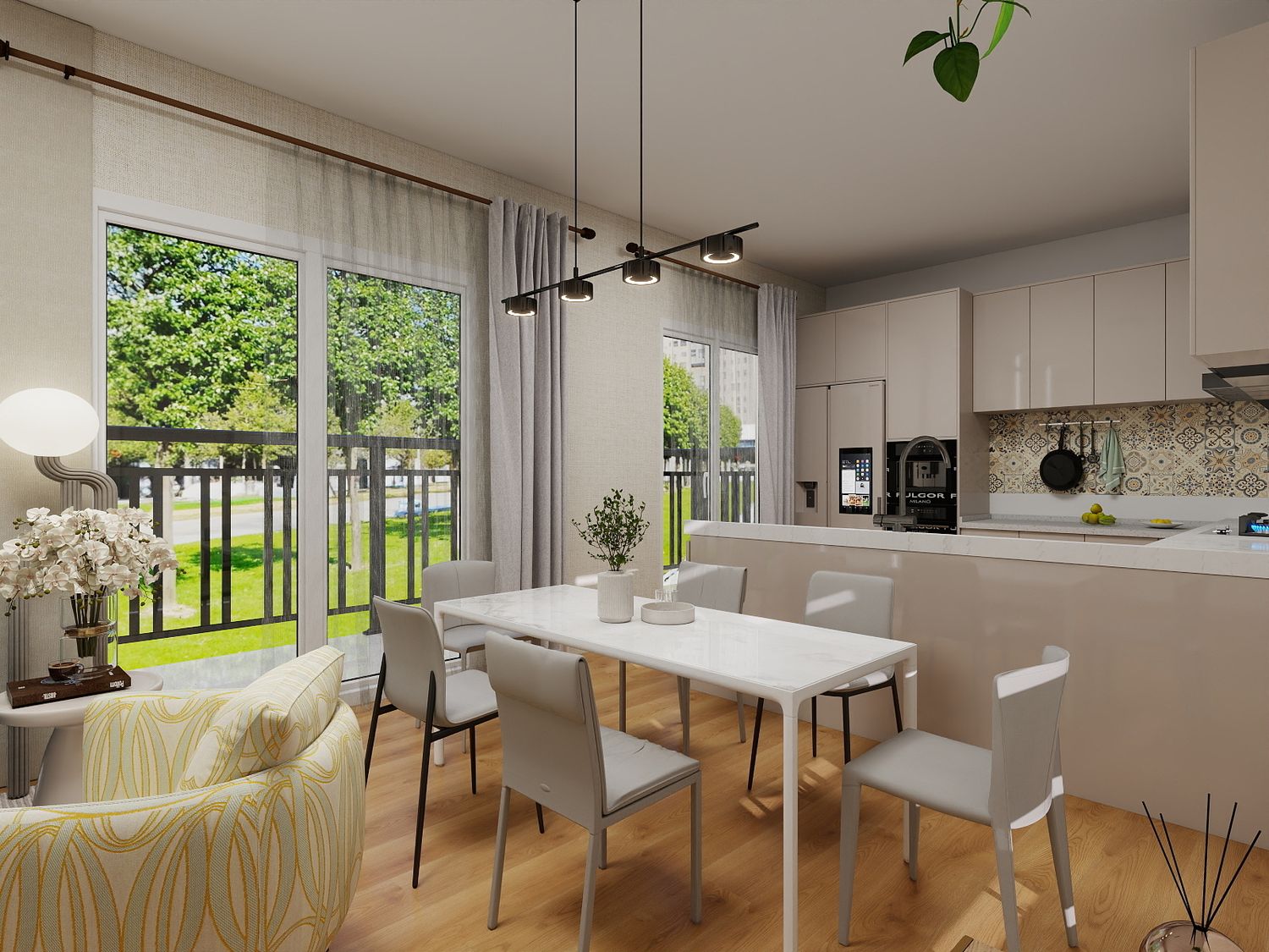 For the dining area, I changed the light fixture above the table from a circular shape to a linear one so that it better fits the rectangular dining table and aligns with its proportions.