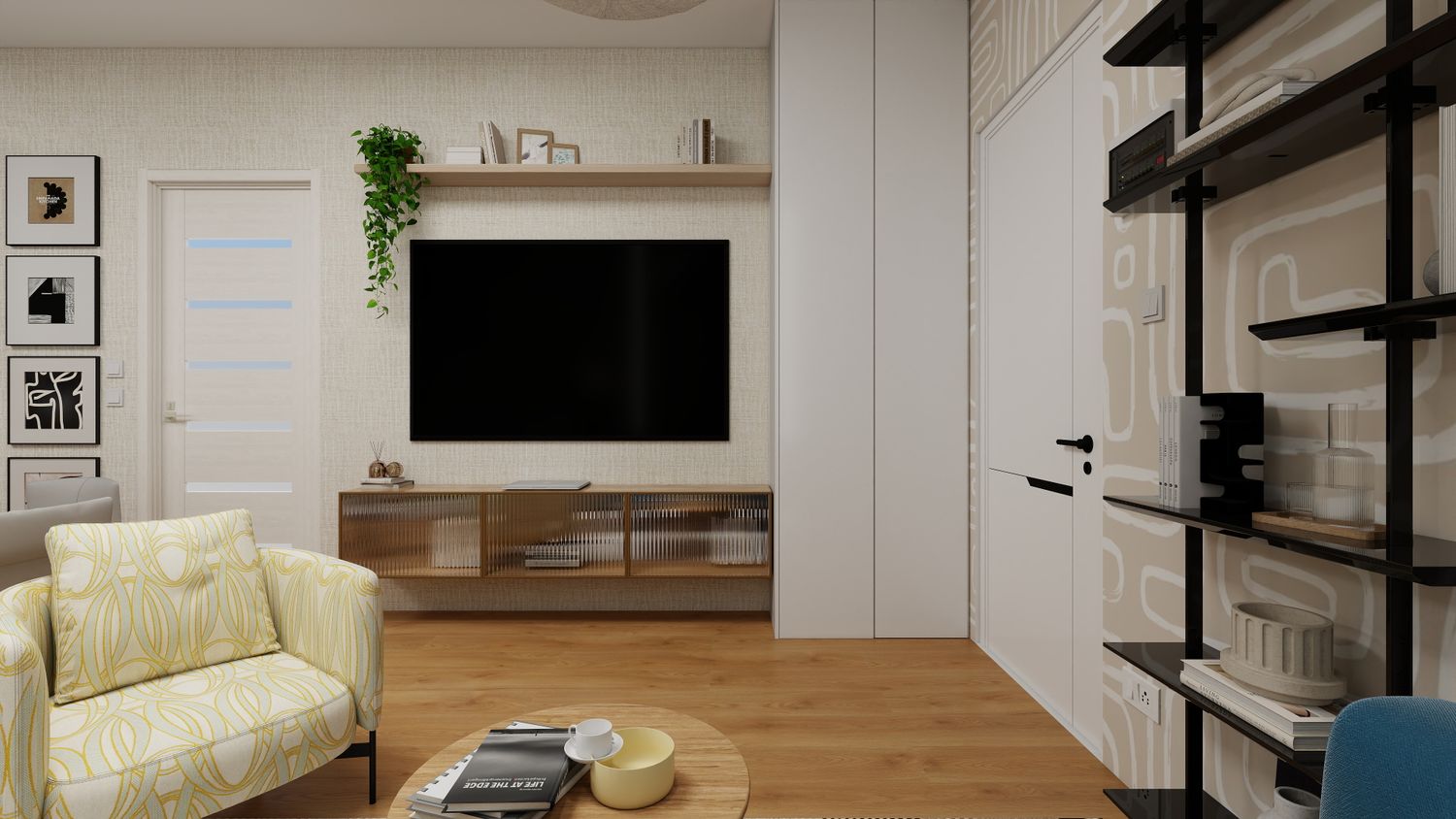 Under the TV, I added a hanging shelf that combines wood and glass materials to create visual variety. The shelf is deep enough to store the items you mentioned. Above the TV, I added another shelf with hanging plants to bring a fresh and lively touch to the space.