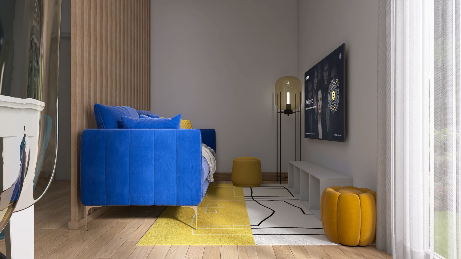 Il progetto nasce con l’obiettivo di riorganizzare la zona living dell’open space senza alterare l’equilibrio dell’ambiente esistente, mantenendo quindi cucina, tavolo, divano e pouf e concentrando l’intervento sulla nuova area TV.