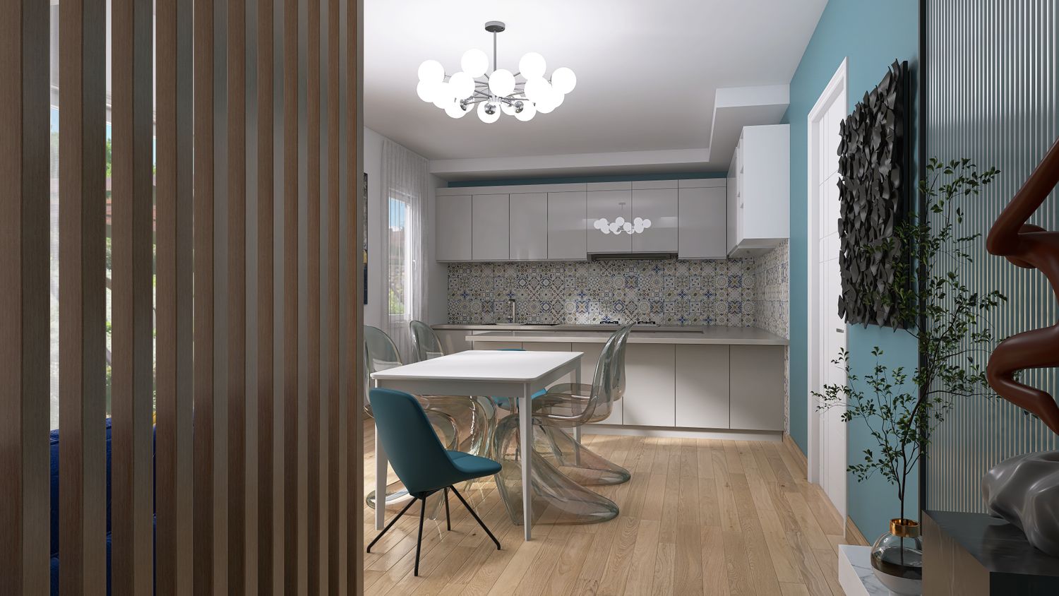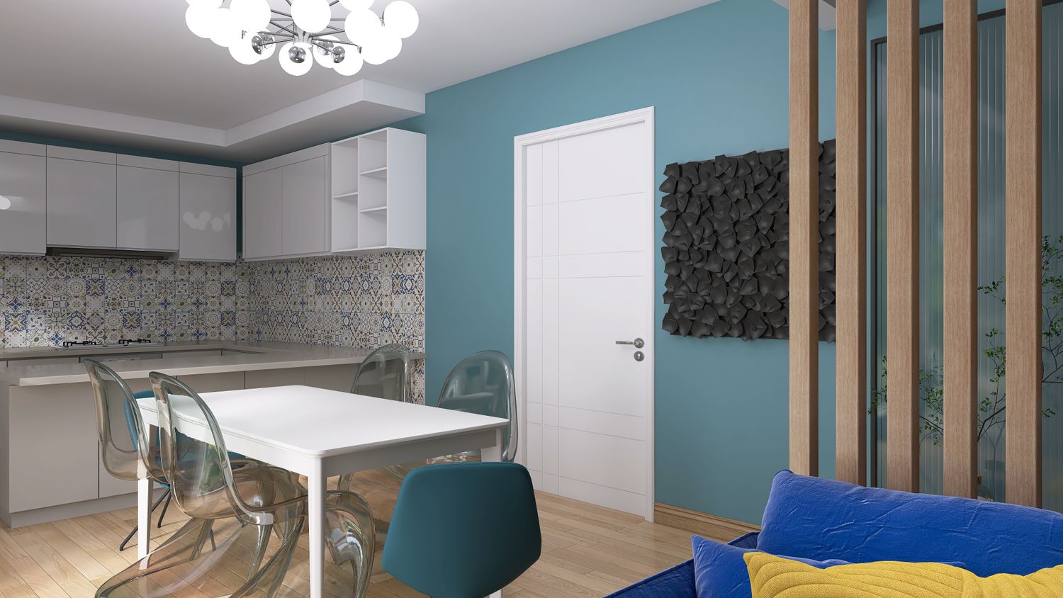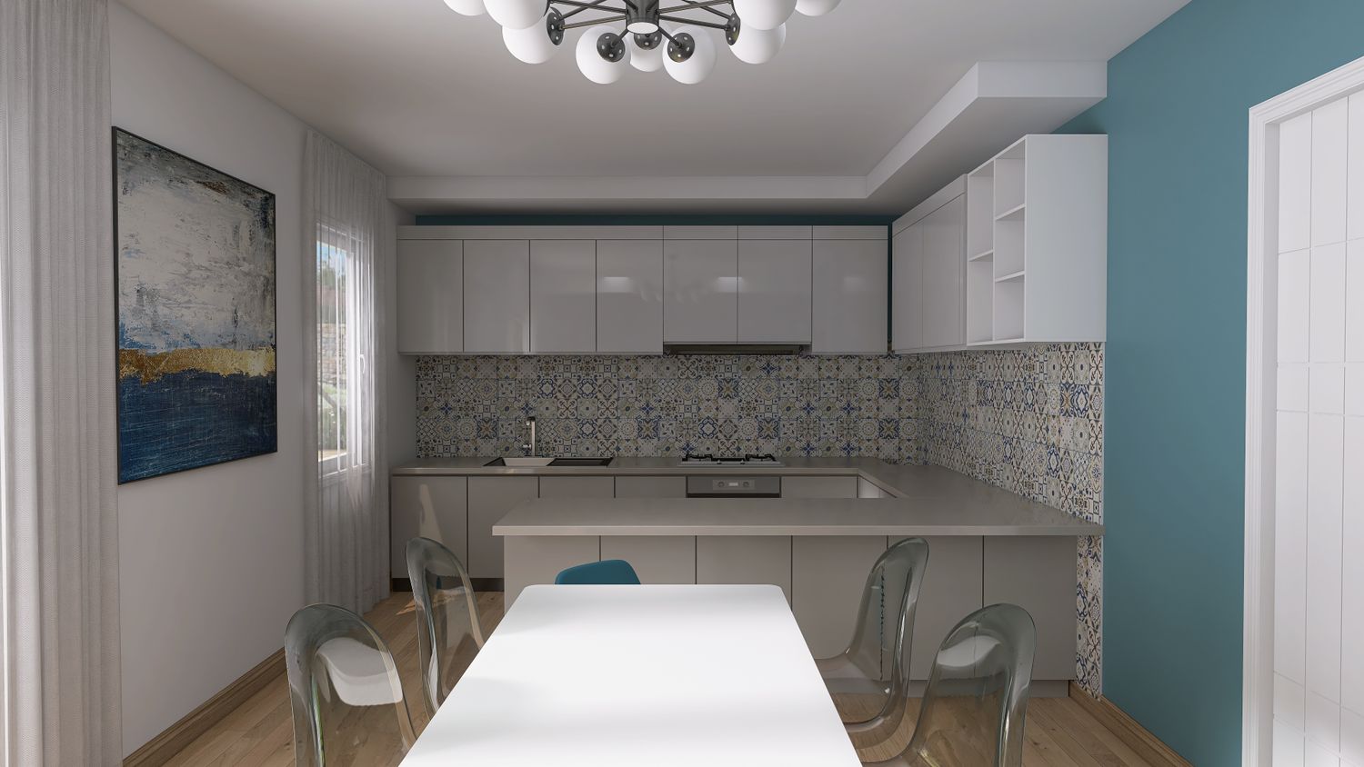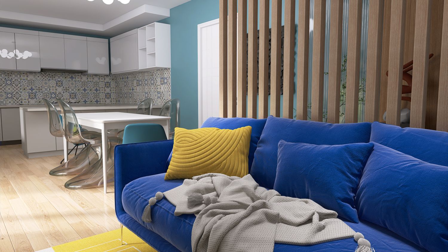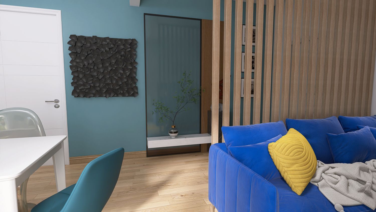 Dal punto di vista cromatico, la proposta evita una palette troppo neutra e valorizza invece i colori già presenti, creando un insieme più armonico tra il divano blu petrolio, la cucina e il rivestimento decorativo. Le pareti vengono ripensate in una tonalità fresca ma morbida, capace di dare personalità alla stanza senza scurirla, mentre i materiali chiari e il legno naturale contribuiscono a mantenere luminosità e calore.
