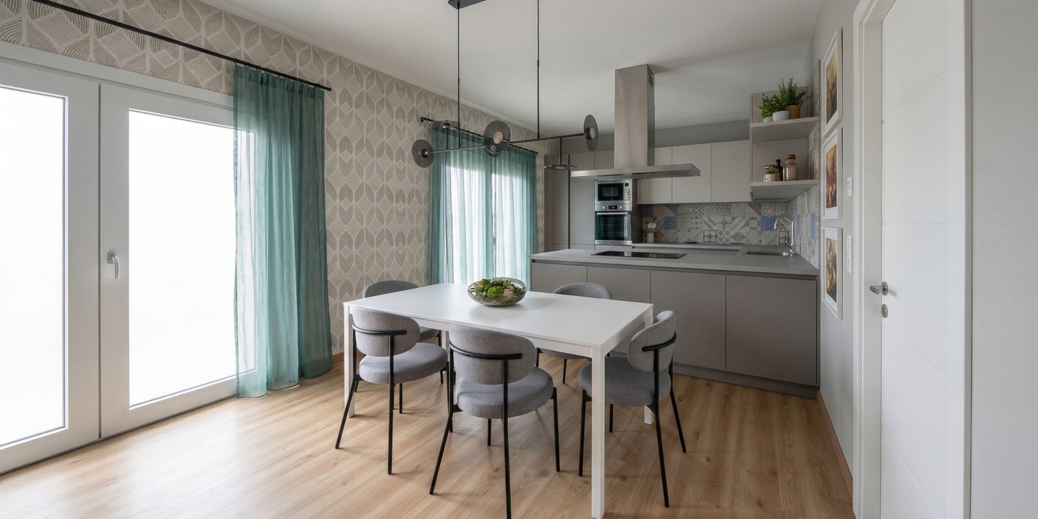 Nella zona pranzo ho mantenuto il tavolo esistente e proposto nuove sedie con struttura nera e rivestimento grigio, in armonia con la cucina. Ho inoltre inserito una nuova lampada a sospensione dal design moderno con struttura nera.
