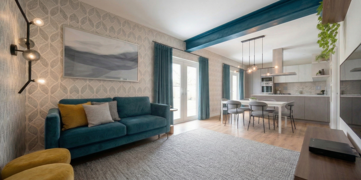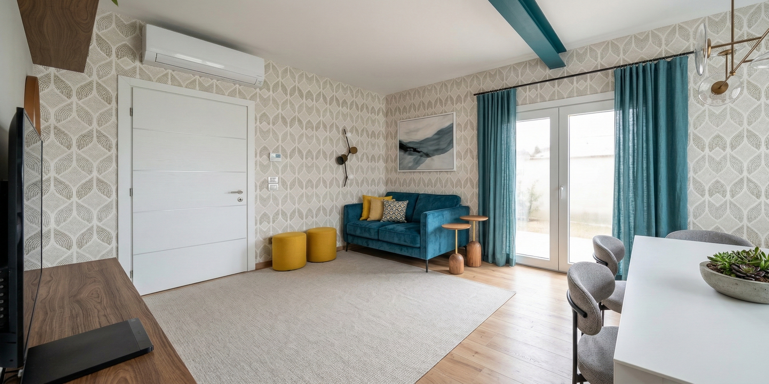 Per le pareti propongo una pittura neutra in una tonalità beige off-white, per creare uno sfondo morbido ed equilibrato. Ho inoltre introdotto una carta da parati con motivo in colori neutri per aggiungere interesse visivo senza appesantire l’ambiente. Suggerisco di applicare la carta da parati sulla parete della porta d’ingresso e anche sulle pareti con le porte finestre. Questa strategia aiuta a evitare un effetto visivo schiacciato e contribuisce invece ad allungare visivamente lo spazio.