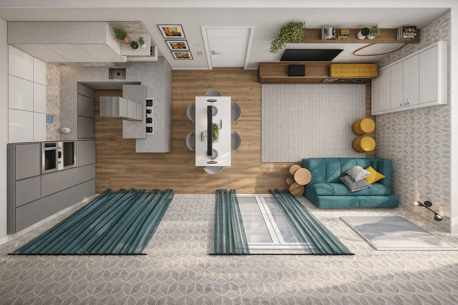 Infine, suggerisco di integrare alcuni dettagli neri in tutto l’ambiente (gambe delle sedie, sospensione della zona pranzo e bastone della tenda) per conferire allo spazio un aspetto più contemporaneo. Questi accenti neri si collegano visivamente anche alle grate di sicurezza delle porte finestre, alle gambe del divano, alla TV e al mobile TV, creando un design coerente ed equilibrato.