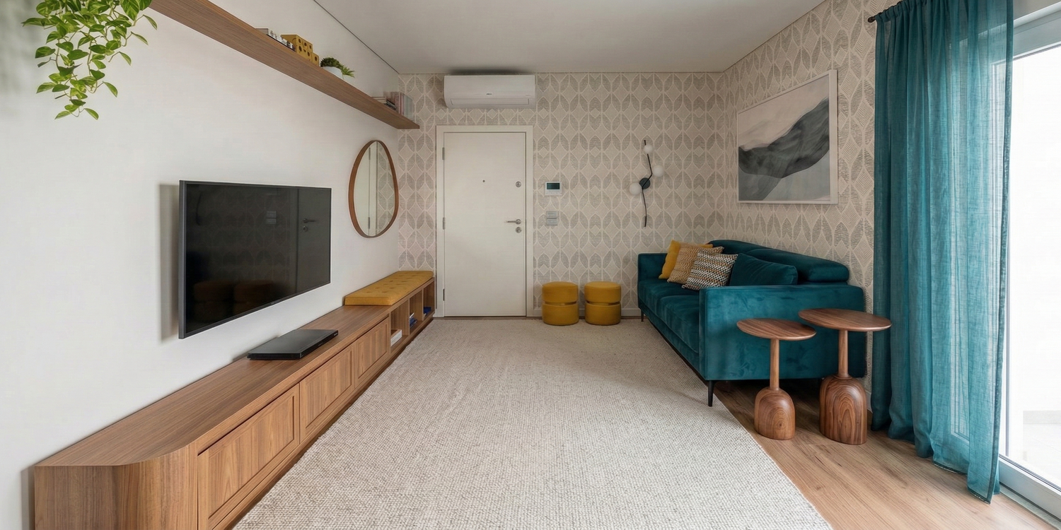 Per aumentare il comfort dello spazio ho inserito un tappeto, così da creare un’atmosfera più accogliente. Suggerisco inoltre una nuova applique da parete con un design audace e distintivo, oltre a nuovi tavolini laterali di appoggio per il divano.