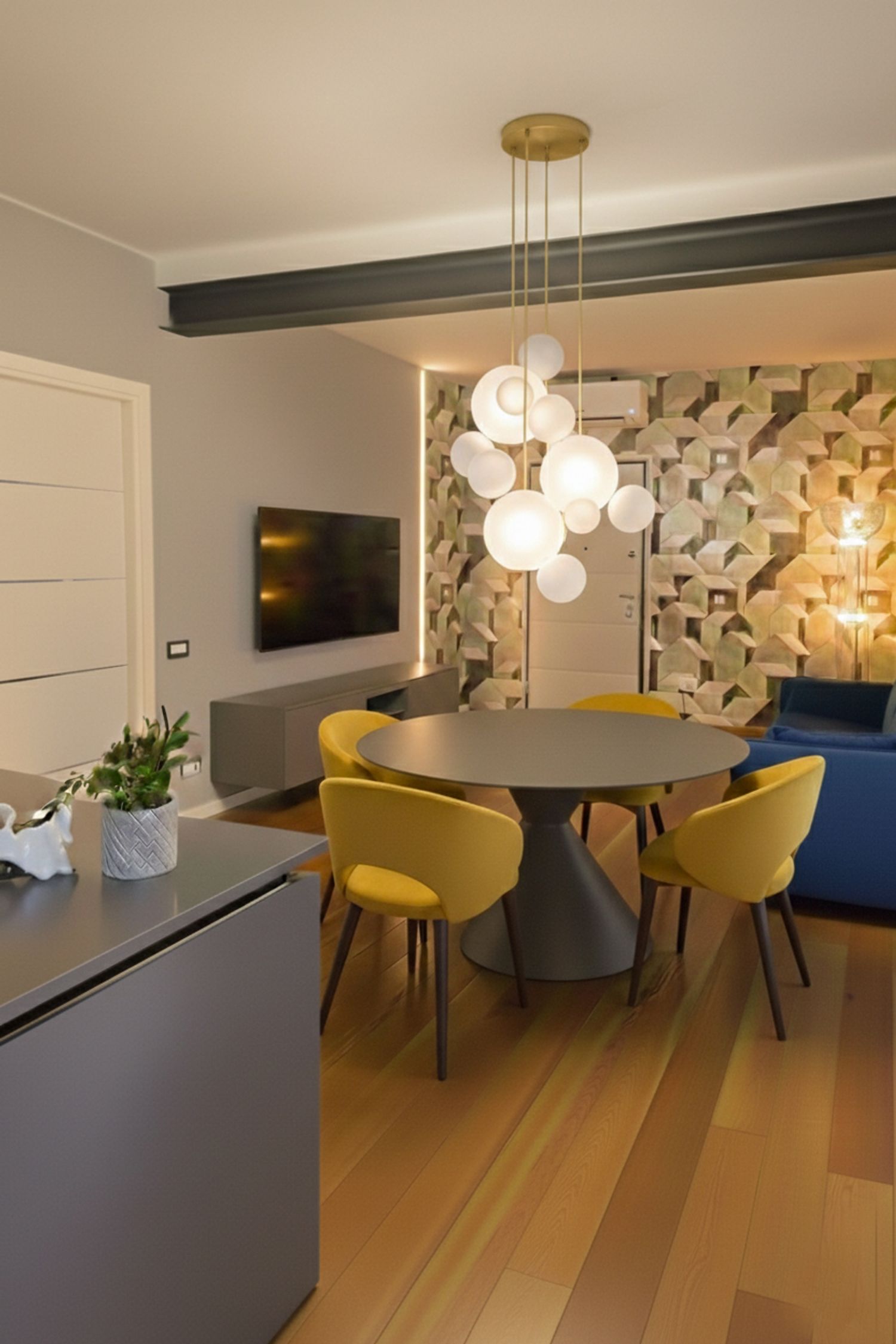 Questa palette fa da "ponte" tra il grigio della cucina, il verde petrolio del divano e il nuovo giallo delle sedie. Non è un colore neutro piatto, ma una texture che dona profondità e carattere fin dall'ingresso.