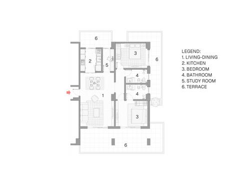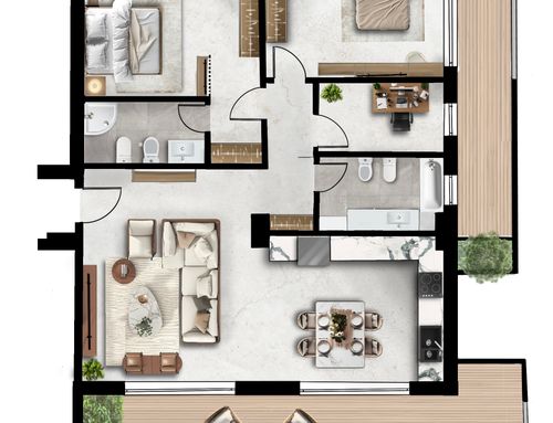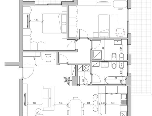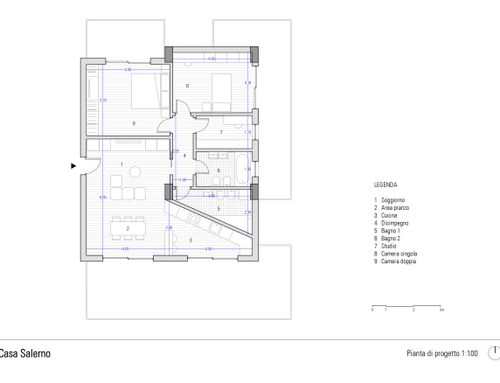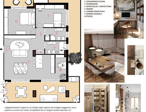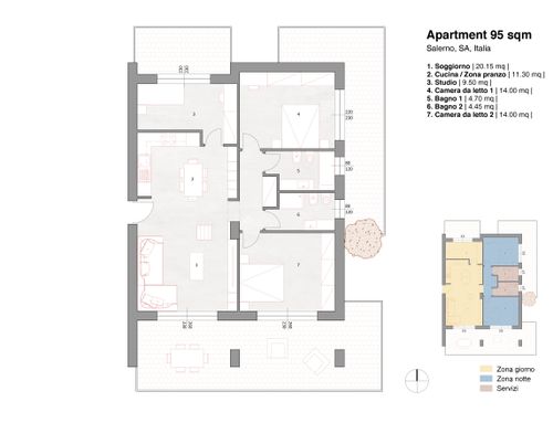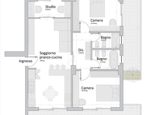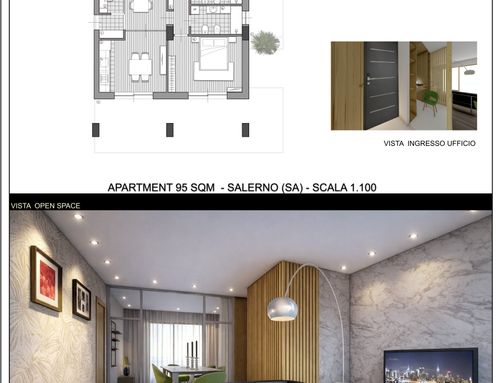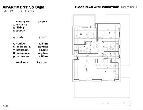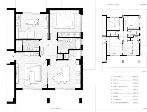 It is a 95 sqm apartment, in a building under construction, where, compared to the preliminary floor plan, I would like to create the largest possible open space (at least 30–32 sqm), two bedrooms (with the single bedroom designed to be as livable and comfortable as possible in view of my daughter’s growth), a small study, and two bathrooms.