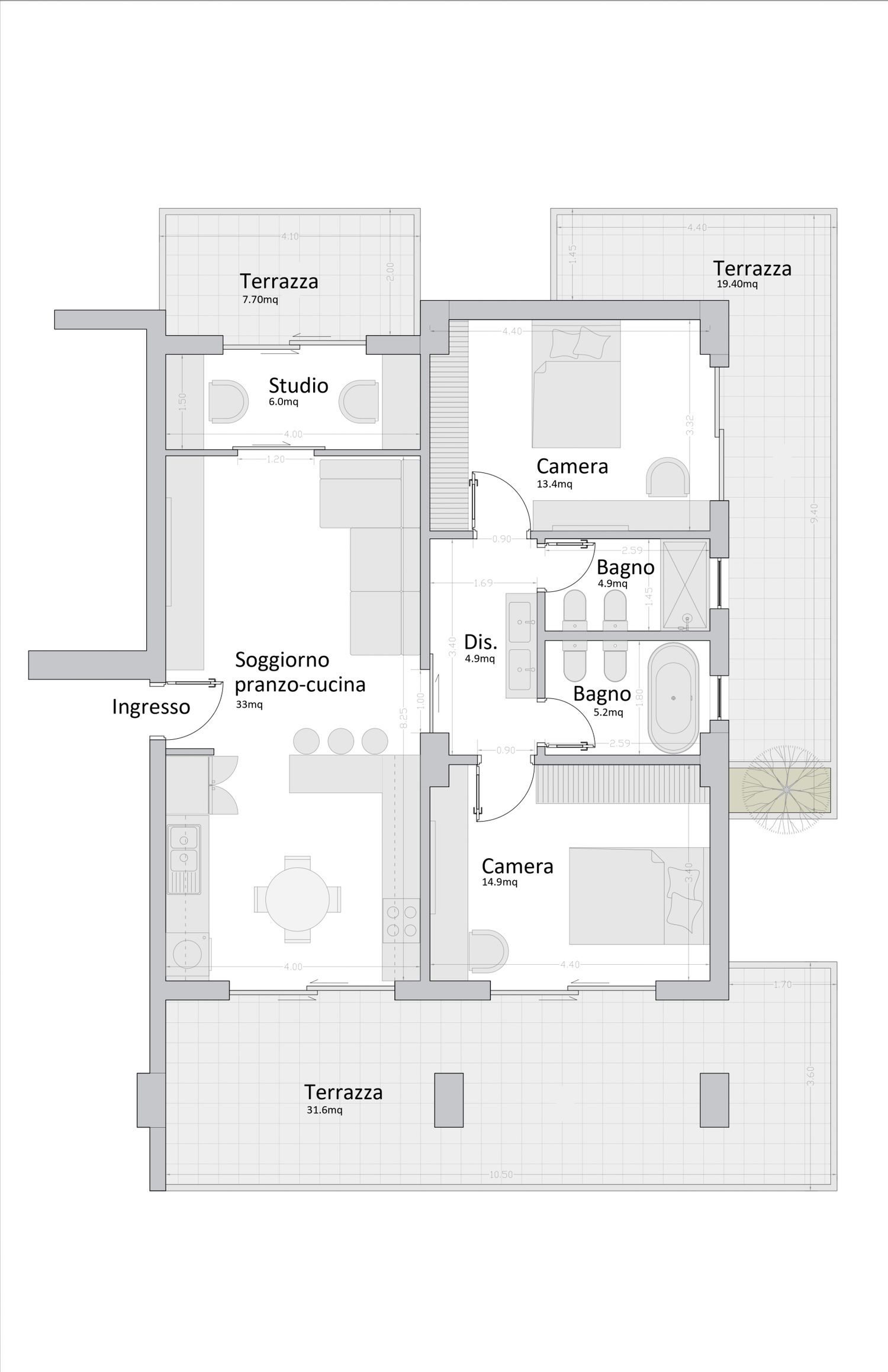 È inoltre previsto uno spazio destinato a studio, con due postazioni di lavoro, accessibile tramite una porta scorrevole, dotato di illuminazione e ventilazione naturale, sfruttando l’accesso alle terrazze.