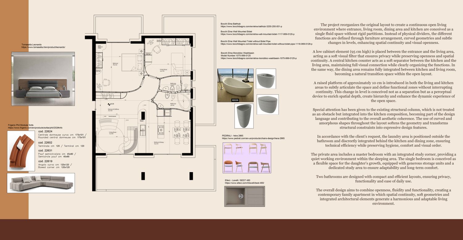 The overall design aims to combine openness, fluidity and functionality, creating a contemporary family apartment in which spatial continuity, soft geometries and integrated architectural elements generate a harmonious and adaptable living environment.