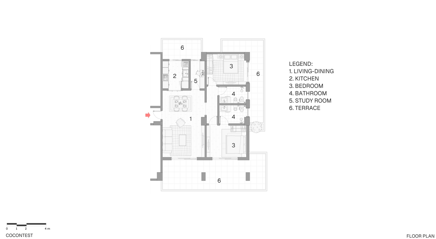 The bedroom and kitchen room are swapped, so that, kitchen can be reduced its size to its minimum size, so that the Living-Dining can get maximum size, plus adding study area.