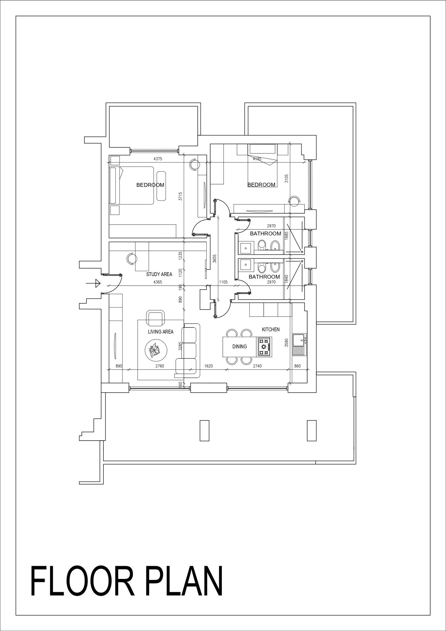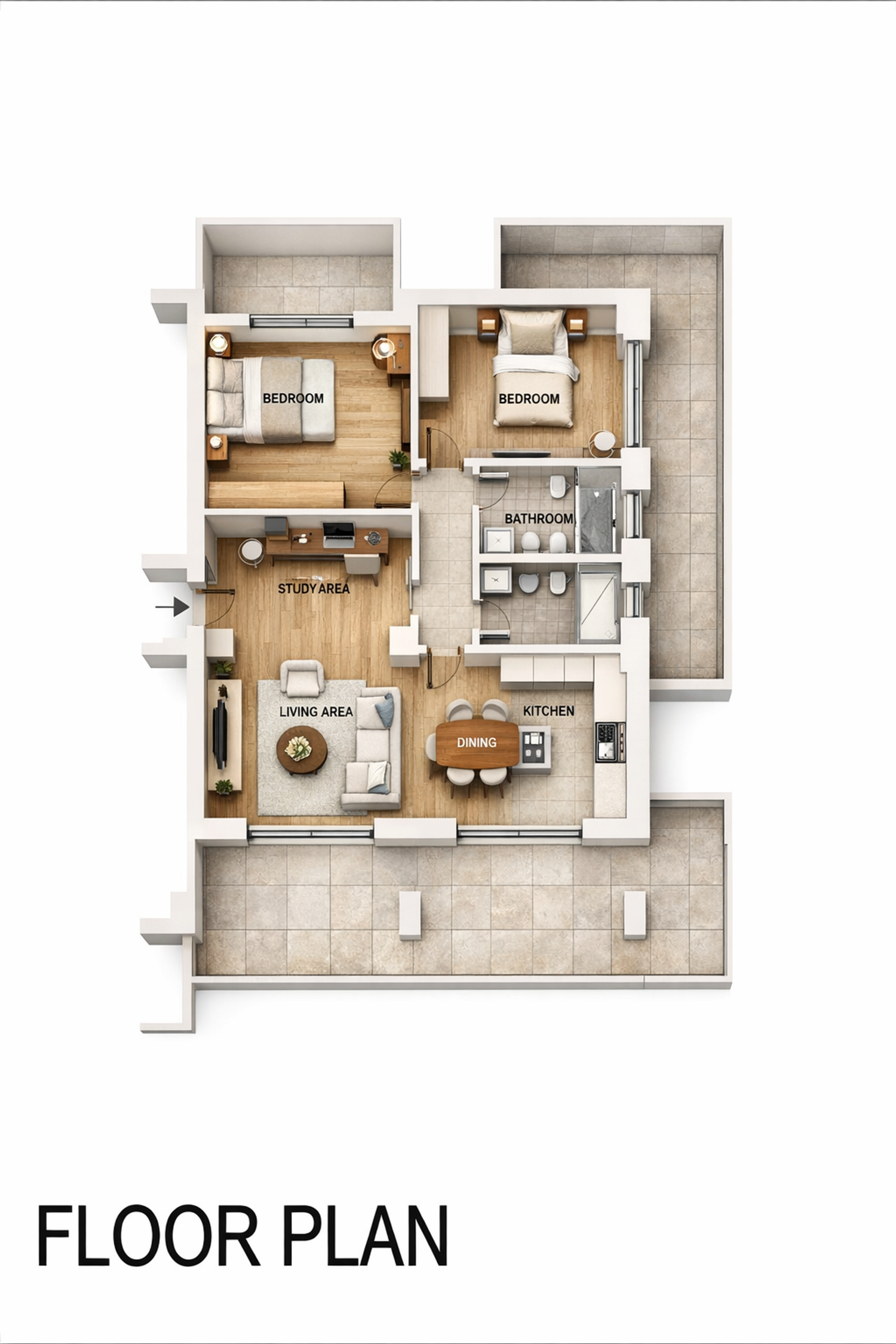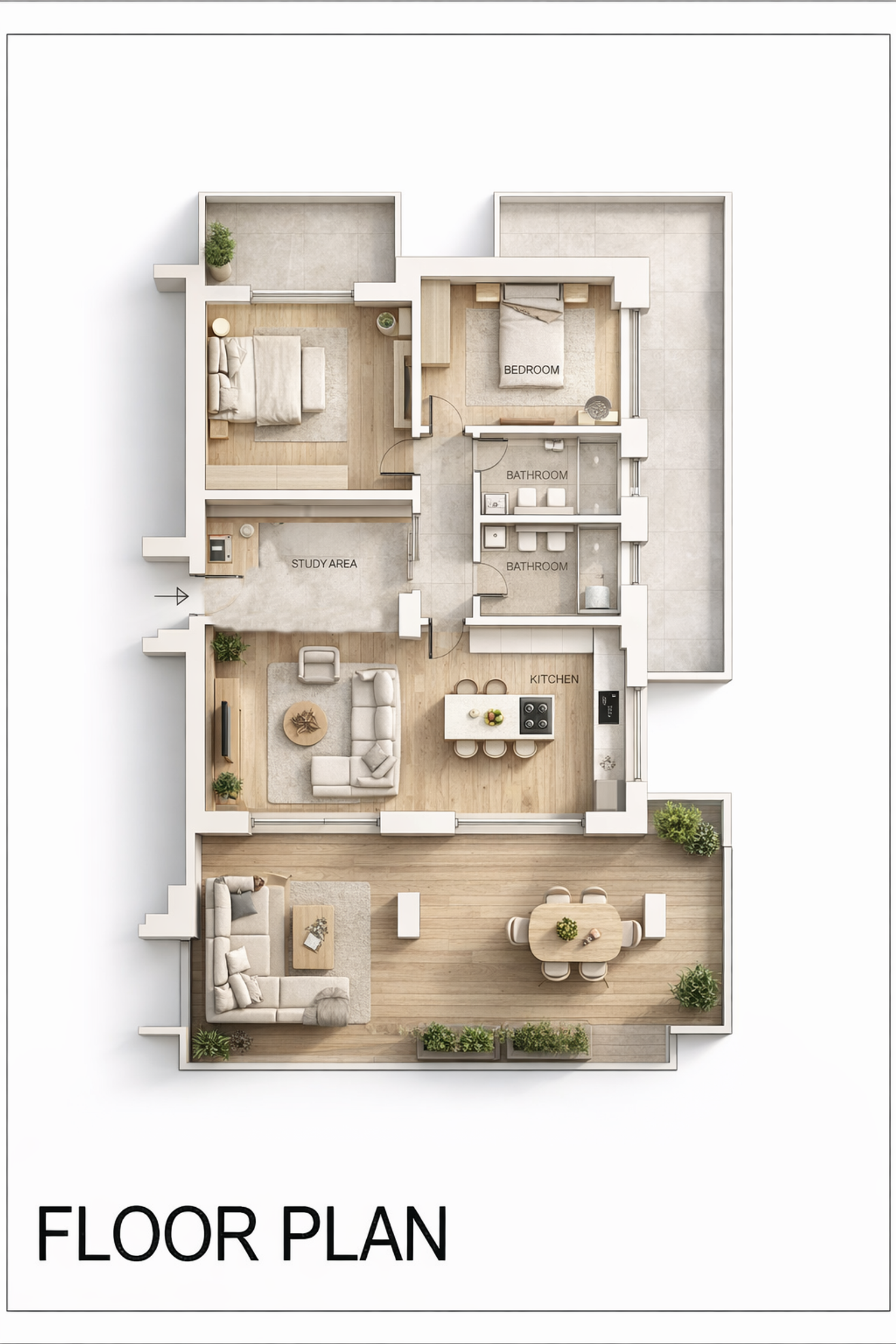 A dedicated study corner has been integrated adjacent to the living space, providing a practical and comfortable study area.