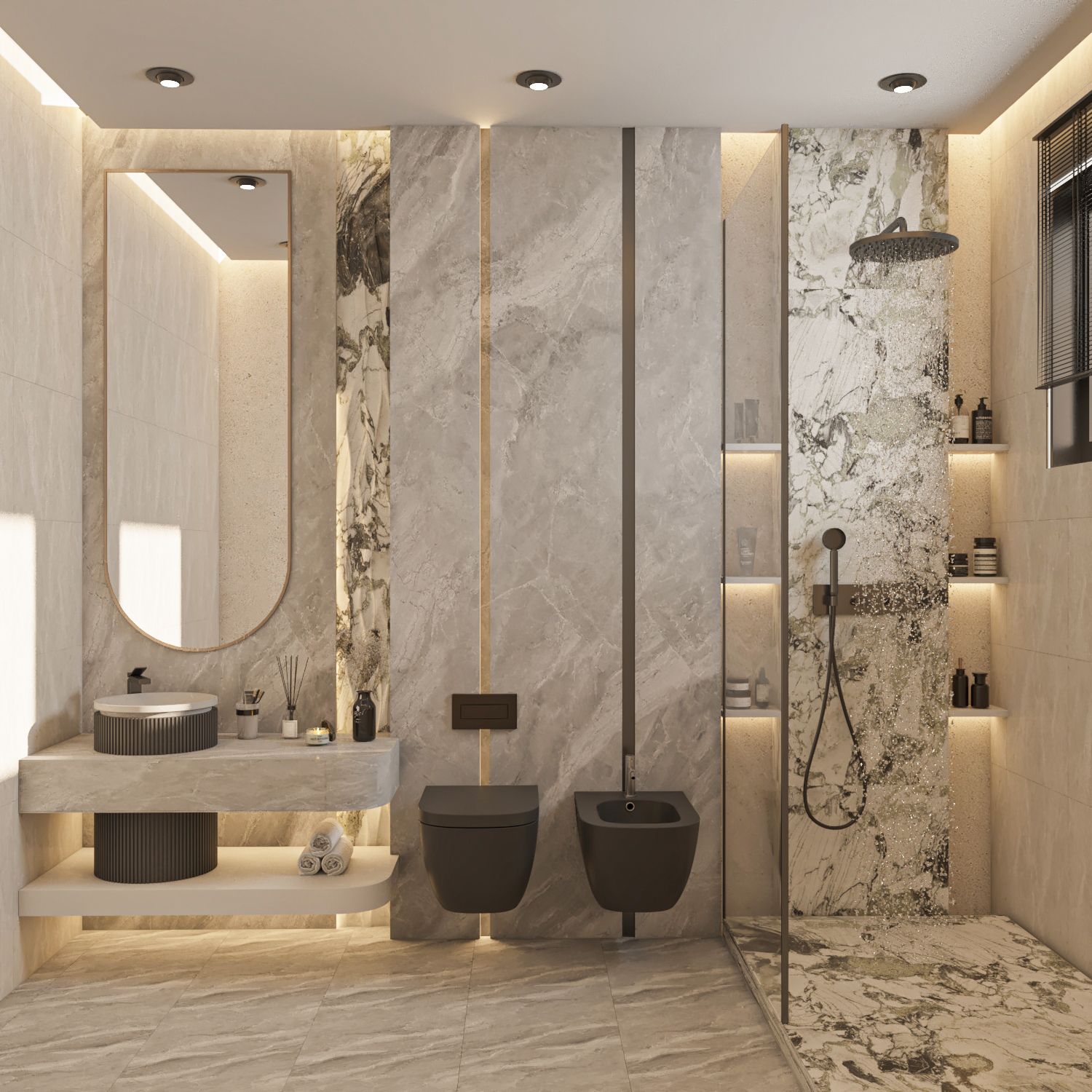 I bagni sono stati progettati in modo efficiente per completare la disposizione complessiva.