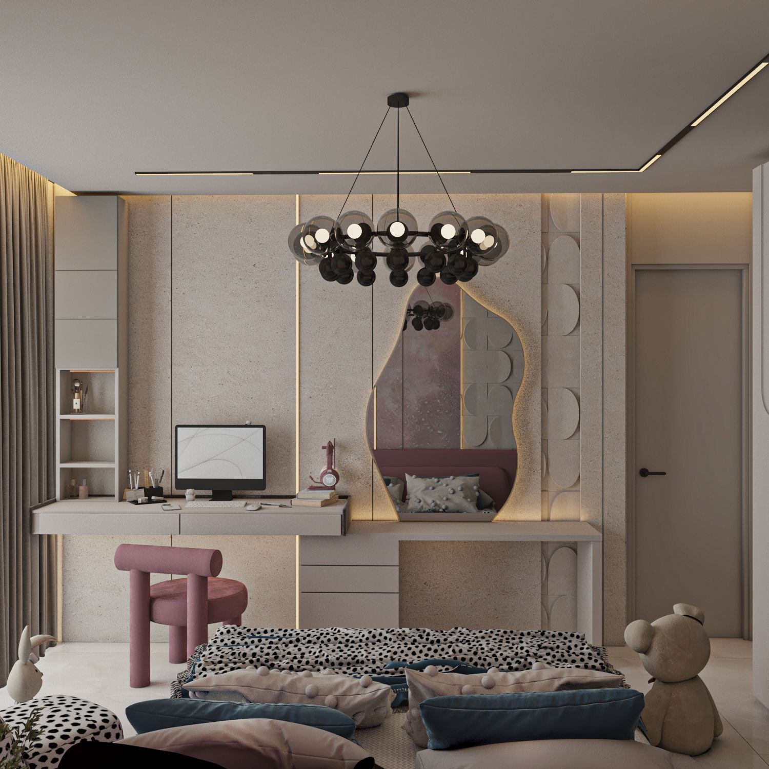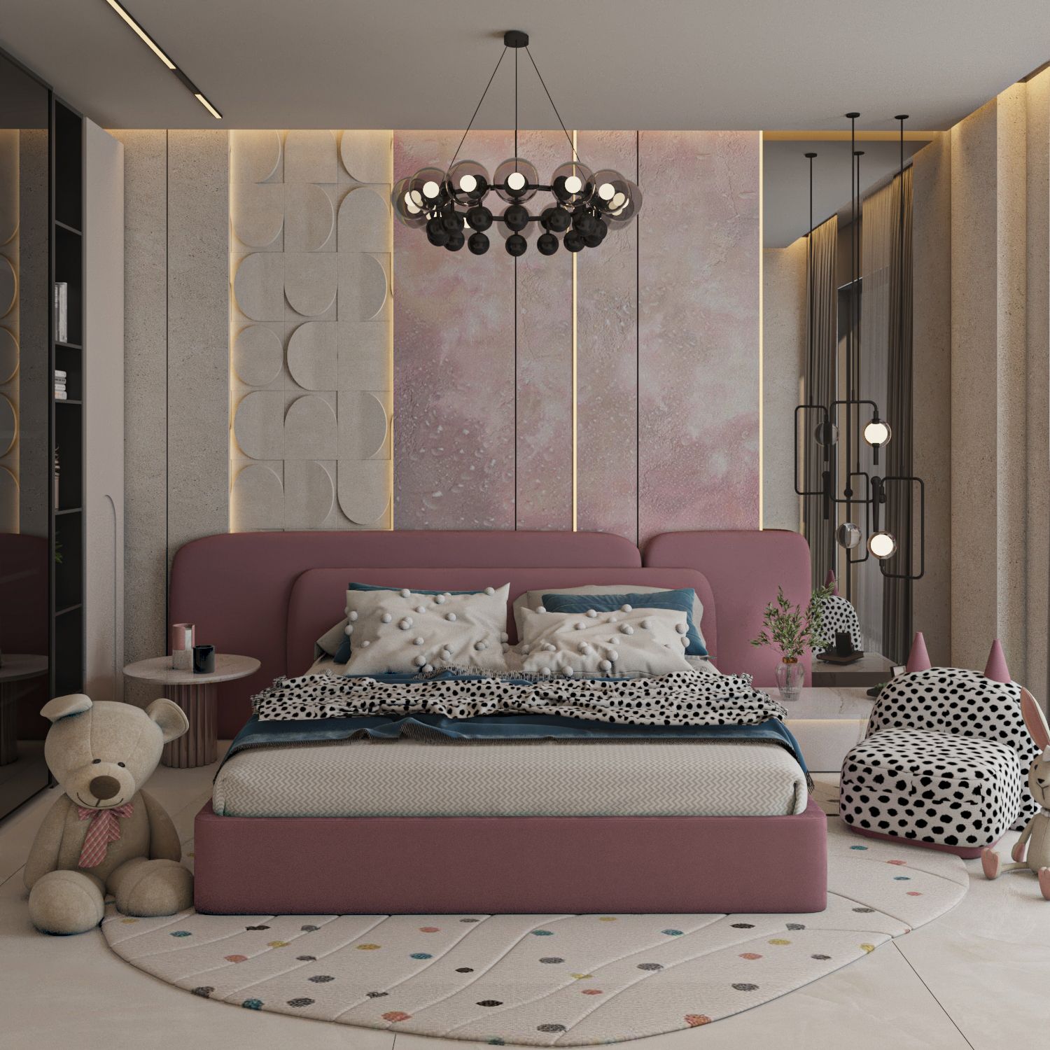 For the bedrooms, we redistributed the furniture to maximize both functionality and aesthetics. The single bedroom has been designed to be as livable and adaptable as possible, ensuring comfort as your daughter grows. The room itself carries a playful and cozy style, with soft pink tones, cheerful patterns, and thoughtful lighting that create a warm, welcoming, and imaginative atmosphere.