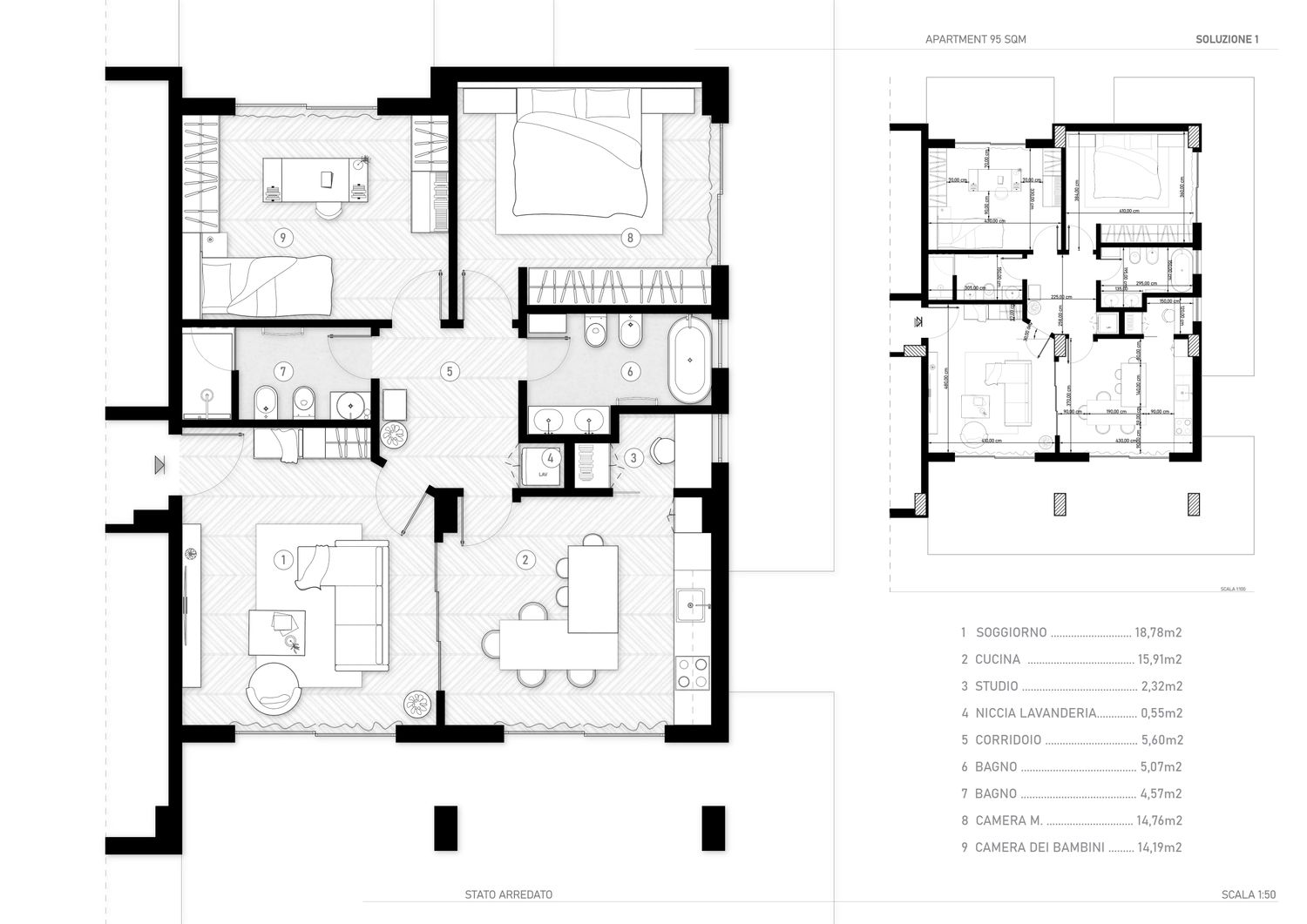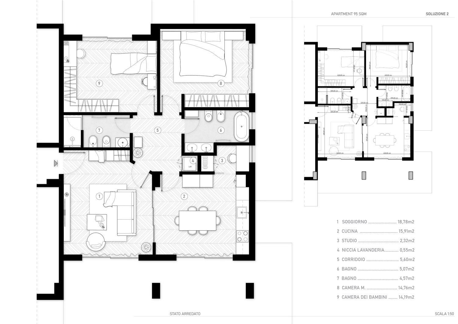 In this solution, the concept was developed around the workspace, which was required to be a separate area with natural light. Based on this requirement, the smaller bathroom was moved closer to the entrance, which led to the master bedroom being relocated to the former children’s bedroom.