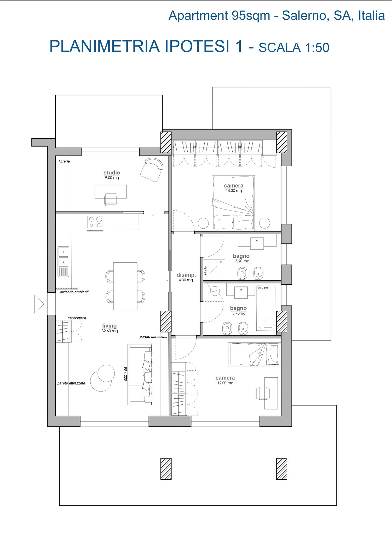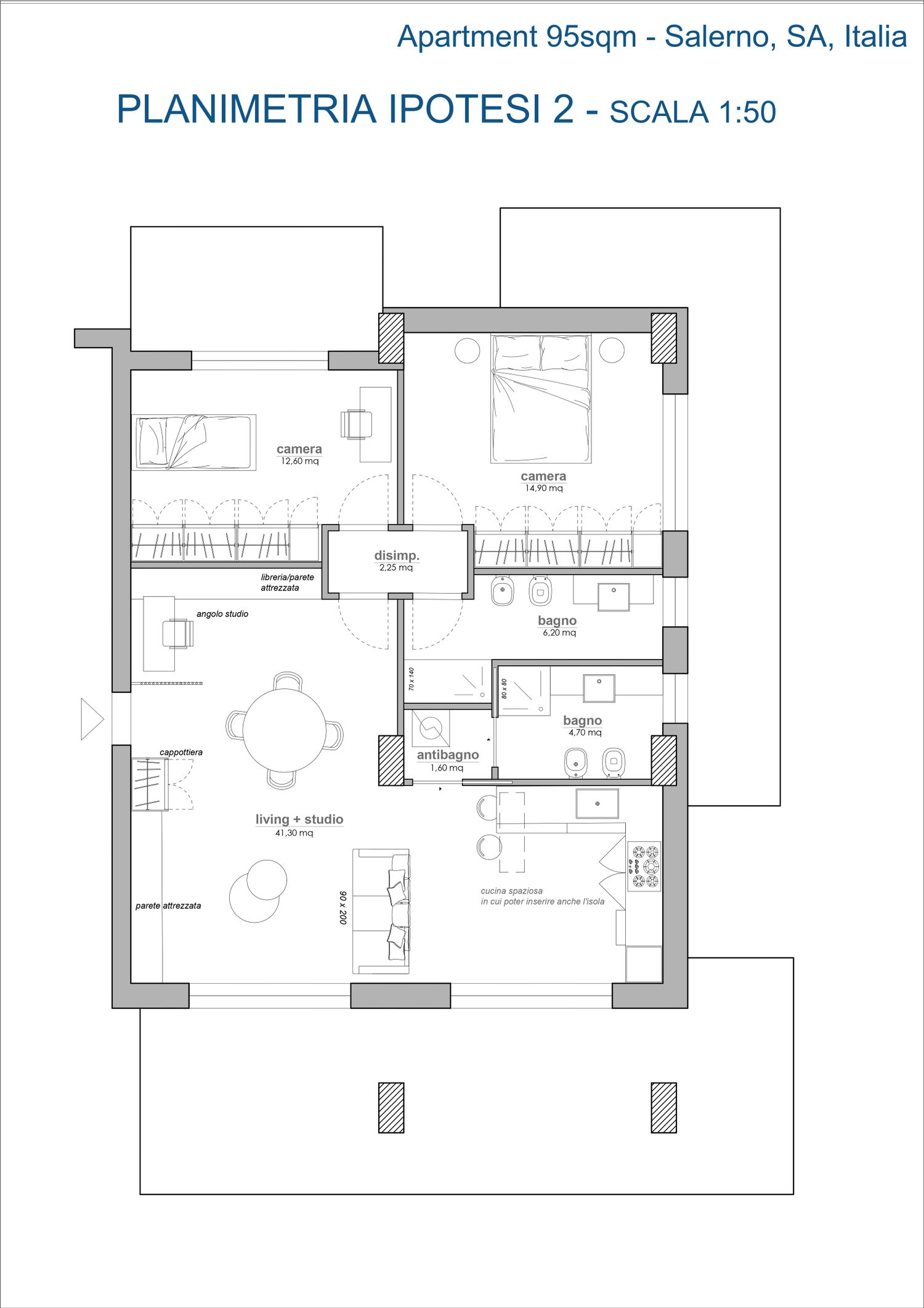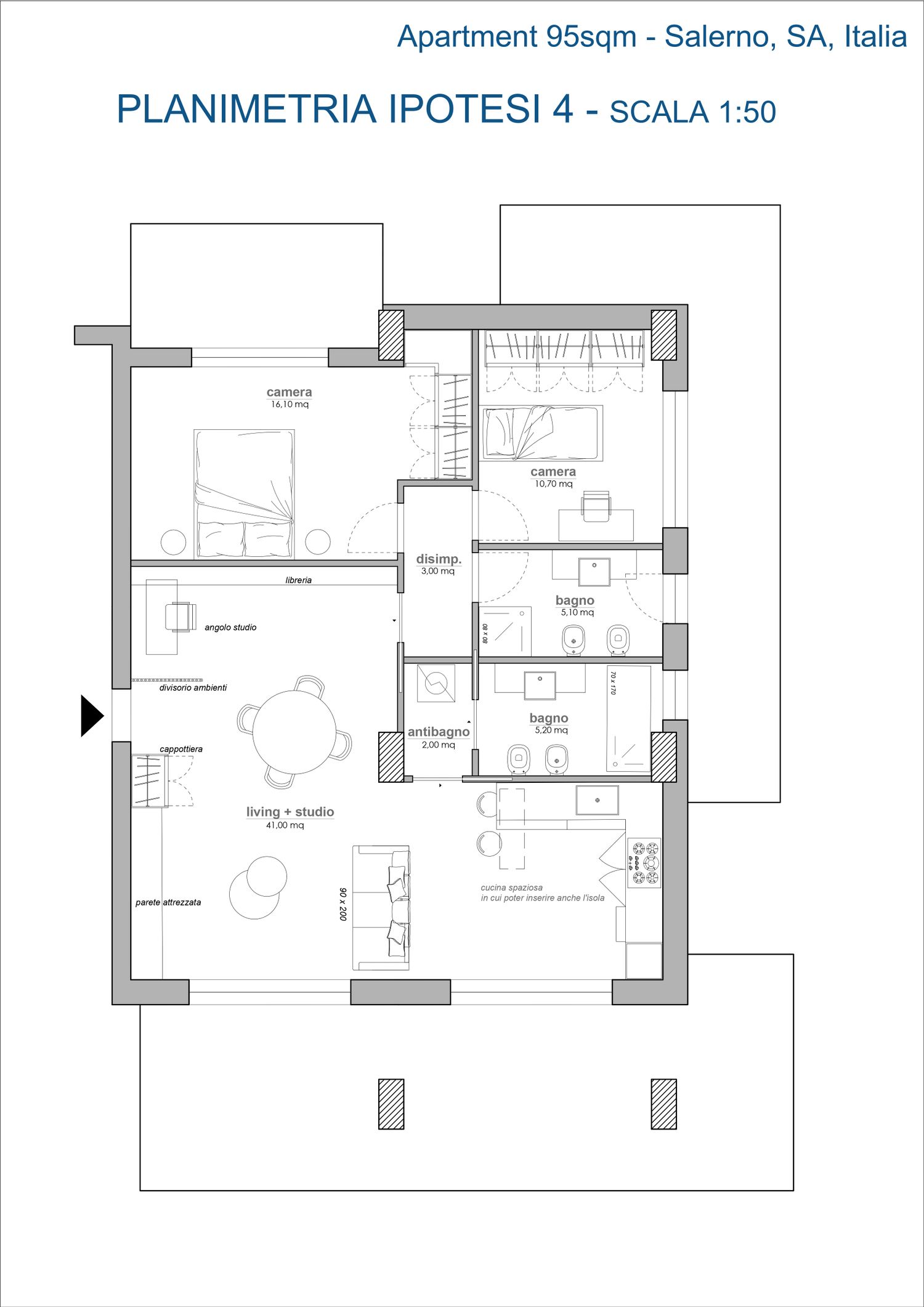 Vengono presentate quattro diverse ipotesi progettuali, accomunate dal medesimo obiettivo: creare spazi ampi, flessibili e abitabili in ogni circostanza. Nel rispetto delle richieste del bando, ĆØ stata inoltre sviluppata una soluzione alternativa che prevede lāinserimento dello studio allāinterno dellāopen space. Questa proposta, da valutare in base alle specifiche esigenze, consente di sfruttare appieno la doppia apertura finestrata dellāarea living, evitando di sacrificarne una per la realizzazione di un ambiente chiuso dedicato allo studio. Ć tuttavia fondamentale concepire lo studio nellāopen space come uno spazio chiaramente definito: se correttamente progettato, può garantire un adeguato livello di privacy pur mantenendo continuitĆ con lāambiente circostante.